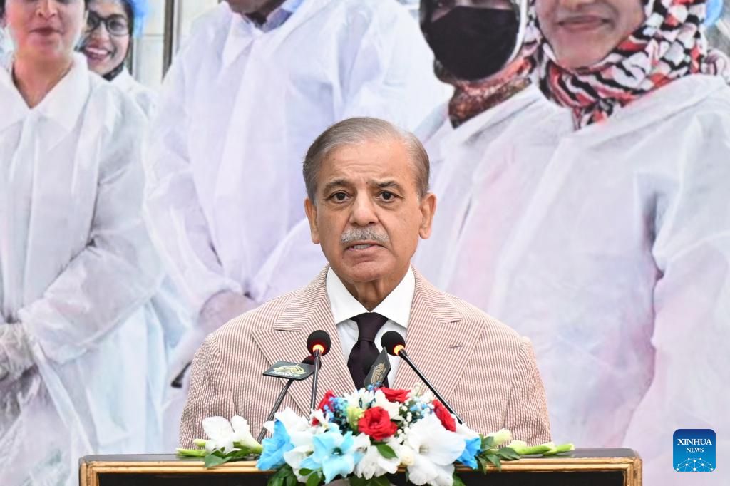 Pakistani Prime Minister Shehbaz Sharif addresses a farewell ceremony for the second batch of 300 students under the Prime Minister's Initiative for Capacity Building of 1,000 Agricultural Graduates in China, in Islamabad, Pakistan, Aug. 22, 2025. Pakistani Prime Minister Shehbaz Sharif on Friday encouraged the country's young agricultural graduates leaving for China to learn modern Chinese practices to help transform Pakistan's farming sector. (Photo by Ahmad Kamal/Xinhua)