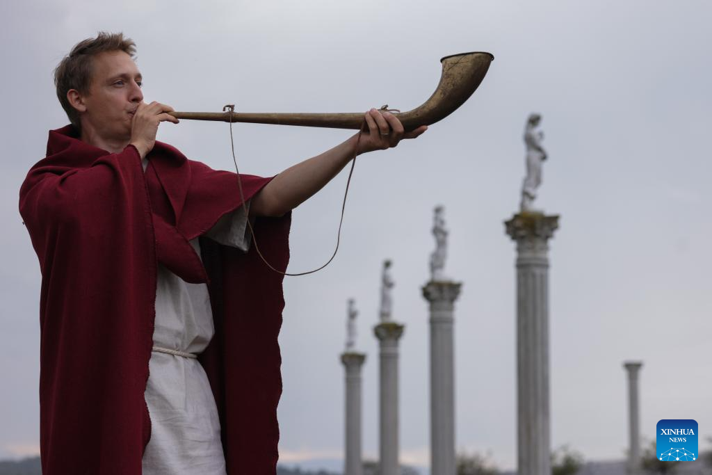 A participant dressed in Roman costume plays the curved Roman military trumpet during the Roman Games Festival in Ptuj, Slovenia, Aug. 23, 2025. The 18th edition of the Roman Games festival kicked off on Friday in Ptuj and will last till Aug. 24. (Photo by Zeljko Stevanic/Xinhua)