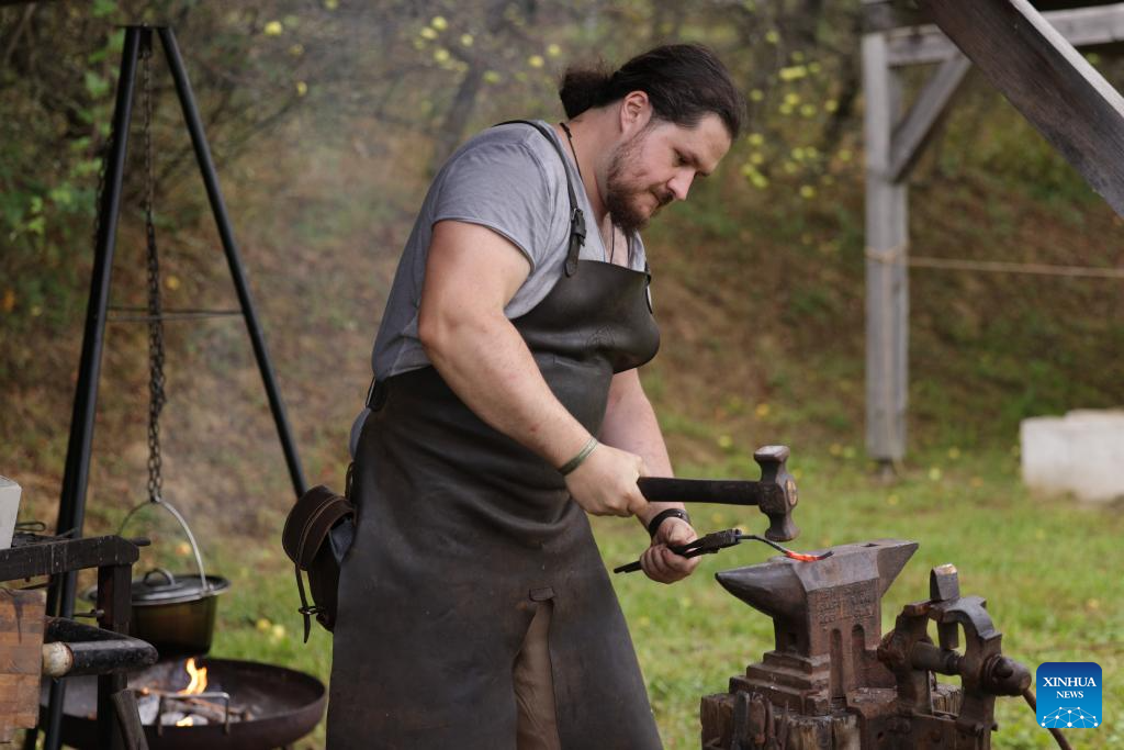 A participant dressed in Roman costume represents a blacksmith profession during the Roman Games Festival in Ptuj, Slovenia, Aug. 23, 2025. The 18th edition of the Roman Games festival kicked off on Friday in Ptuj and will last till Aug. 24. (Photo by Zeljko Stevanic/Xinhua)