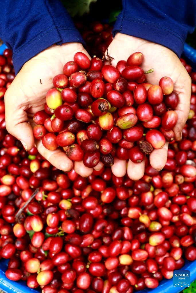 A farmer holds red cherries of robusta coffee beans at a plantation in Bener Meriah regency, Aceh province, Indonesia, on Aug. 24, 2025. (Photo by Yulham/Xinhua)