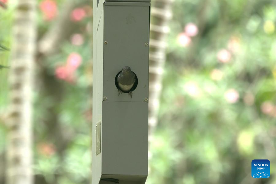 This photo taken in May 2024 shows a "bird nest light" at Futian mangrove ecological park in Shenzhen, south China's Guangdong Province. TO GO WITH "Across China: Lampposts in south China's Shenzhen double as cozy bird nurseries" (Xinhua)