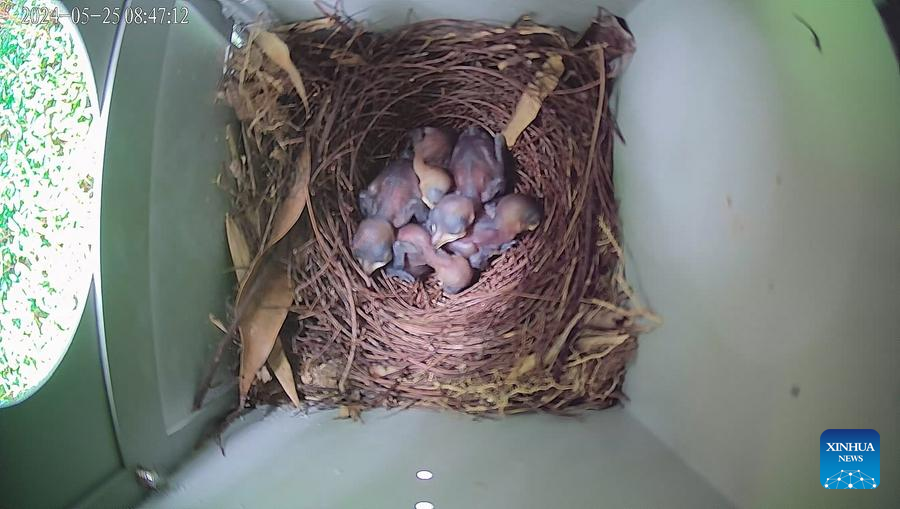 This image captured on May 25, 2024 shows oriental magpie robin nestlings inside a "bird nest light" at Futian mangrove ecological park in Shenzhen, south China's Guangdong Province. TO GO WITH "Across China: Lampposts in south China's Shenzhen double as cozy bird nurseries" (Xinhua)