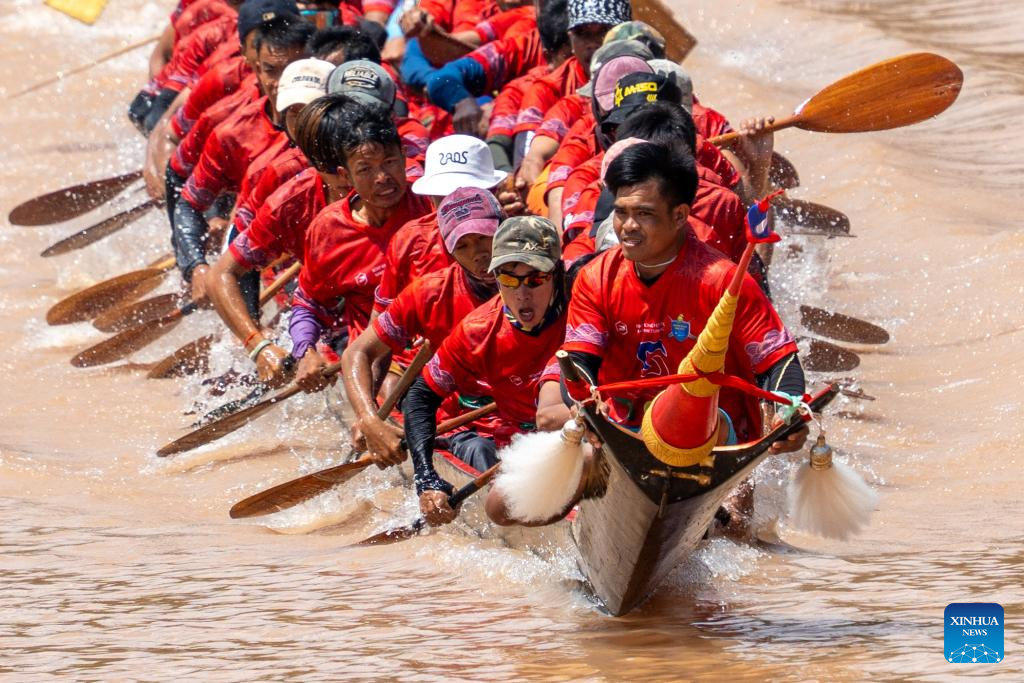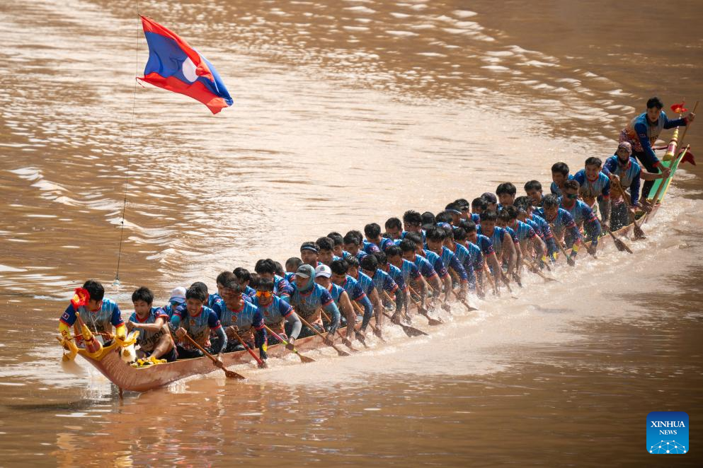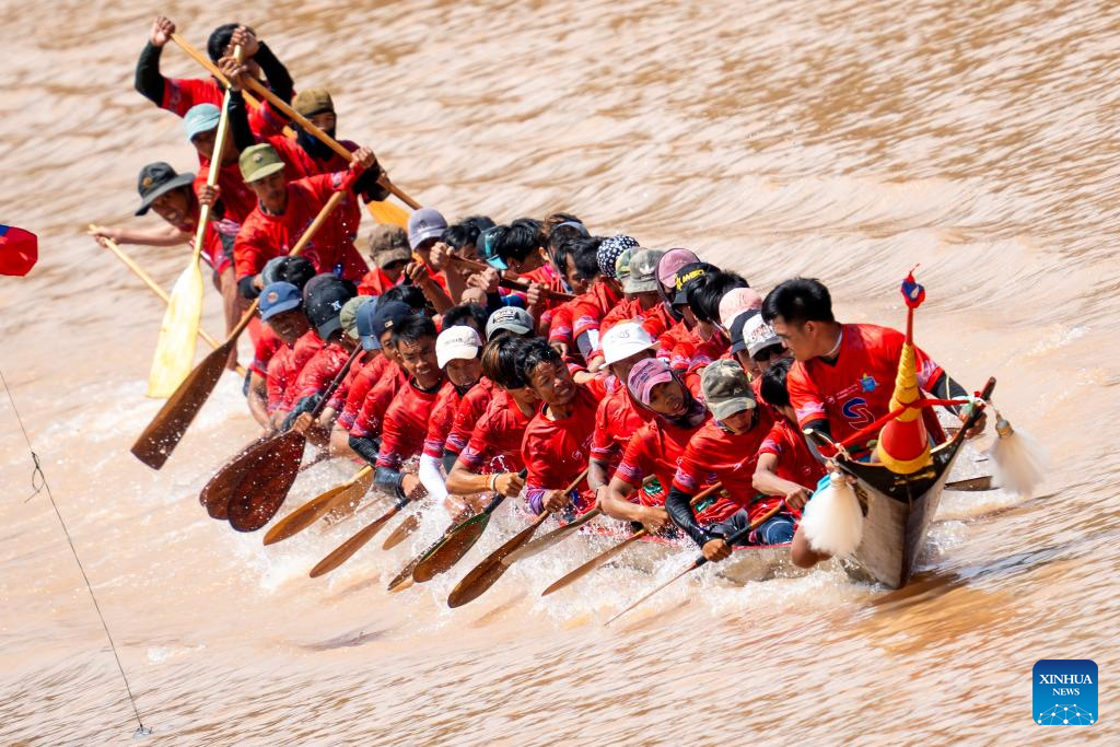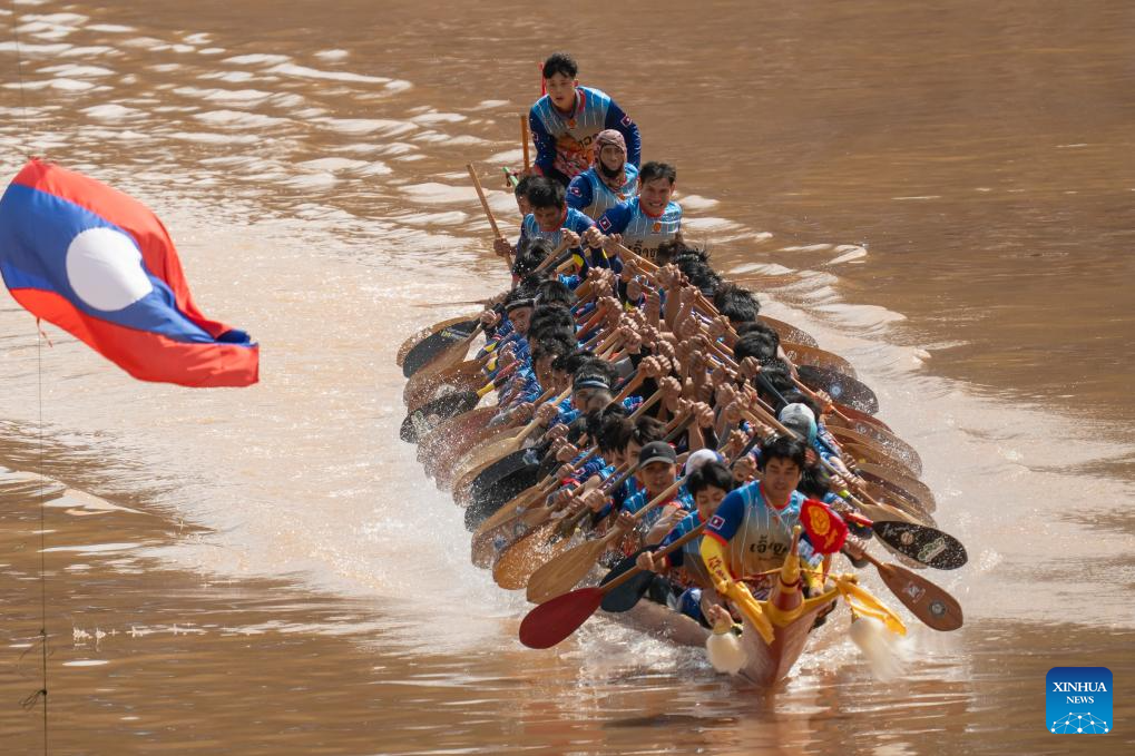 A dragon boat team competes in the dragon boat racing festival in Luang Prabang, Laos on Aug. 23, 2025. The annual dragon boat racing festival was held in Luang Prabang on Saturday. (Photo by Kaikeo Saiyasane/Xinhua)
