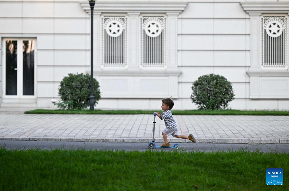 A child plays in front of the Tajikistan parliament building in Dushanbe, Tajikistan, Aug. 23, 2025. Dushanbe is the capital of Tajikistan, as well as the country's economic and cultural center. (Xinhua/Li Renzi)