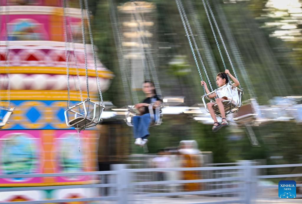 Children enjoy an amusement facility in Dushanbe, Tajikistan, Aug. 23, 2025. Dushanbe is the capital of Tajikistan, as well as the country's economic and cultural center. (Xinhua/Li Renzi)