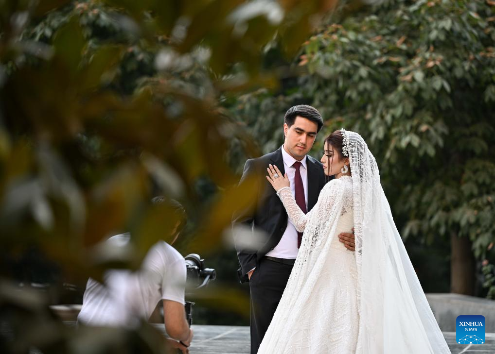 A couple poses for photos in Dushanbe, Tajikistan, Aug. 23, 2025. Dushanbe is the capital of Tajikistan, as well as the country's economic and cultural center. (Xinhua/Li Renzi)