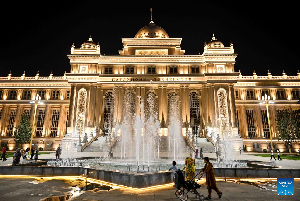 This photo taken on Aug. 23, 2025 shows the night view of the Tajikistan parliament building in Dushanbe, Tajikistan. Dushanbe is the capital of Tajikistan, as well as the country's economic and cultural center. (Xinhua/Li Renzi)
