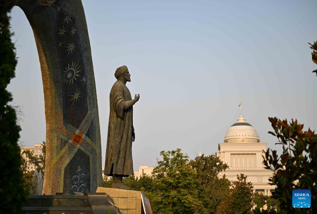 This photo taken on Aug. 23, 2025 shows Rudaki Park and the Tajikistan parliament building in Dushanbe, Tajikistan. Dushanbe is the capital of Tajikistan, as well as the country's economic and cultural center. (Xinhua/Li Renzi)