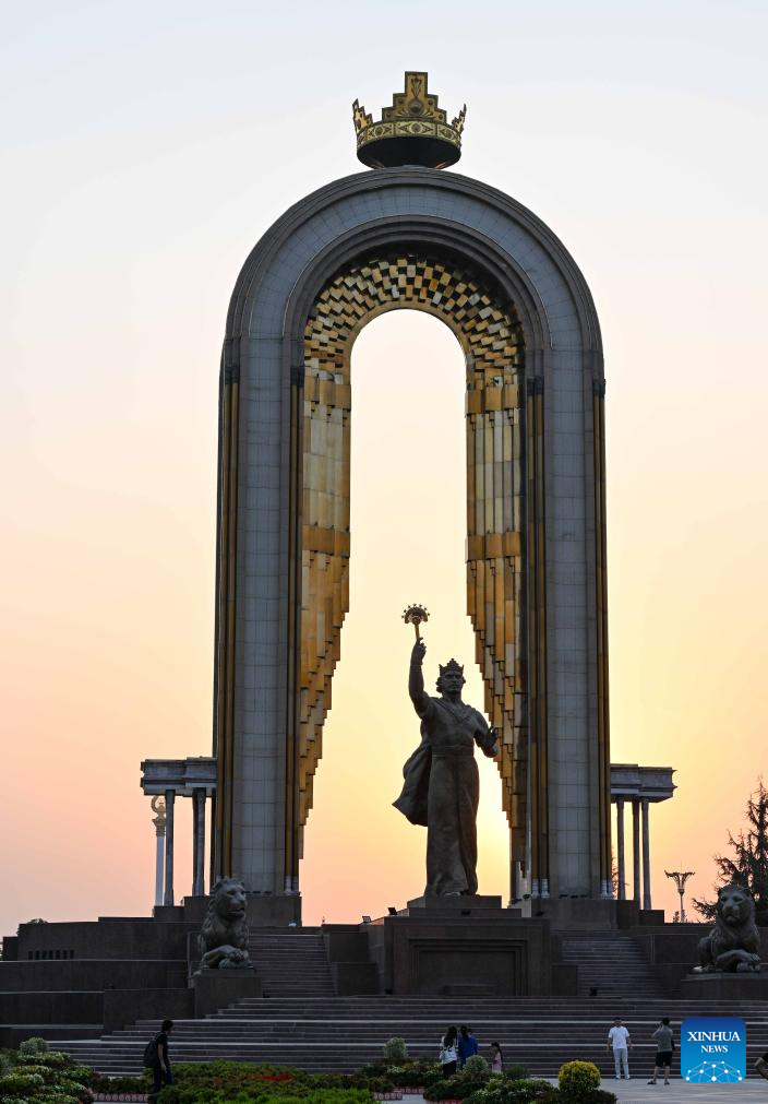 People visit the monument of Ismoil Somoni in Dushanbe, Tajikistan, Aug. 23, 2025. Dushanbe is the capital of Tajikistan, as well as the country's economic and cultural center. (Xinhua/Li Renzi)