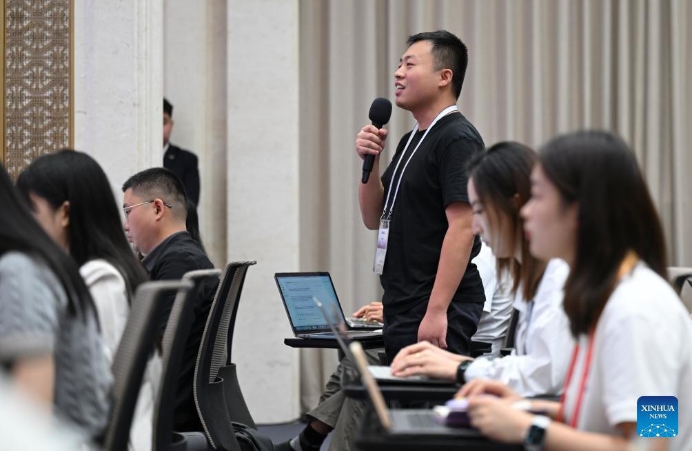 A journalist asks questions at a press conference held by the State Council Information Office (SCIO) on China Customs' achievements in safeguarding borders and promoting high-quality development in the 14th Five-Year Plan period (2021-2025) in Beijing, capital of China, Aug. 25, 2025. (Xinhua/Chen Yehua)