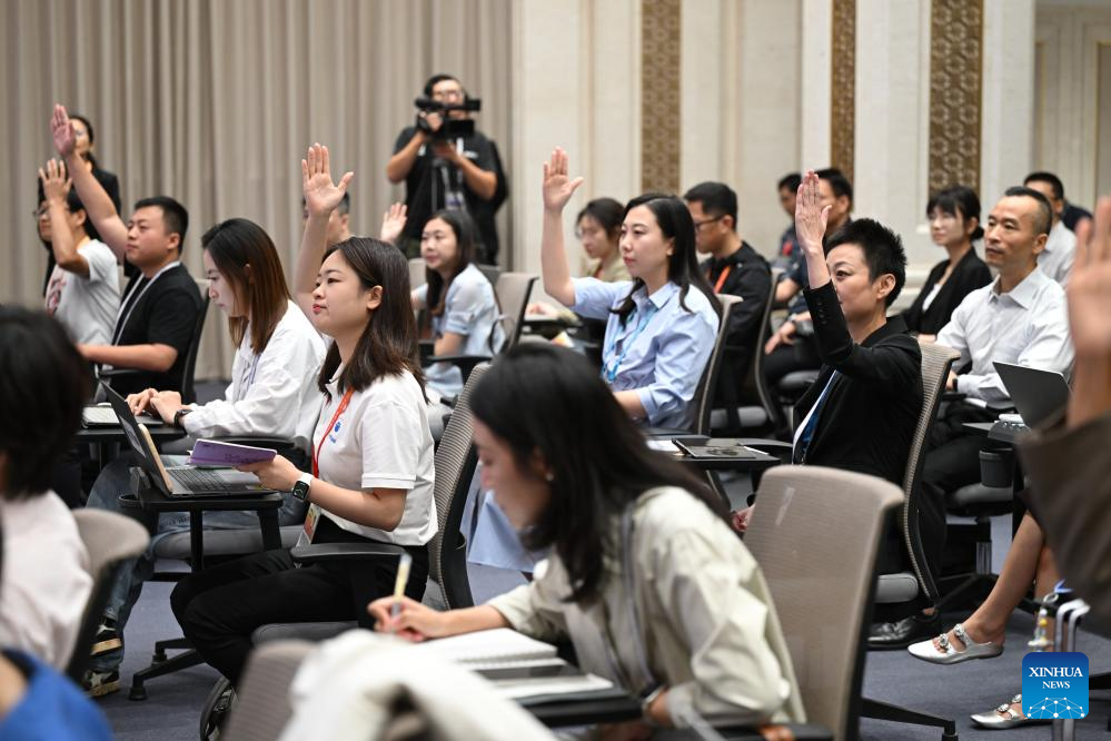 Media professionals work at a press conference held by the State Council Information Office (SCIO) on China Customs' achievements in safeguarding borders and promoting high-quality development in the 14th Five-Year Plan period (2021-2025) in Beijing, capital of China, Aug. 25, 2025. (Xinhua/Chen Yehua)