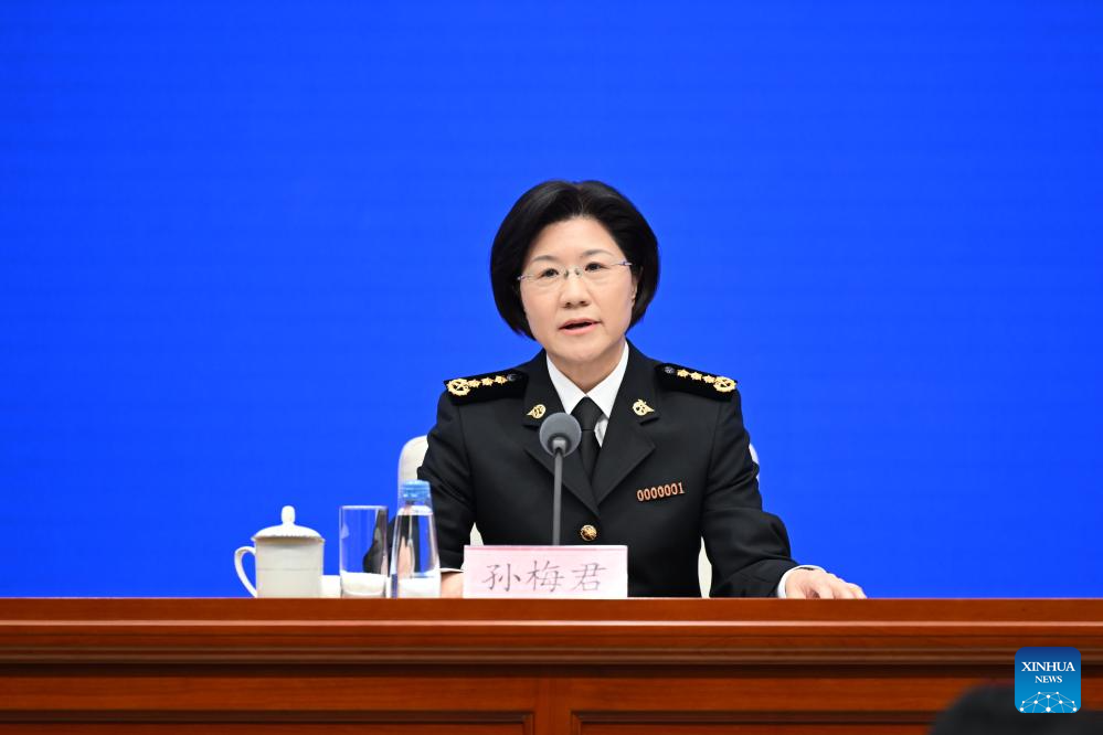 Sun Meijun, head of the General Administration of Customs, speaks at a press conference held by the State Council Information Office (SCIO) on China Customs' achievements in safeguarding borders and promoting high-quality development in the 14th Five-Year Plan period (2021-2025) in Beijing, capital of China, Aug. 25, 2025. (Xinhua/Chen Yehua)