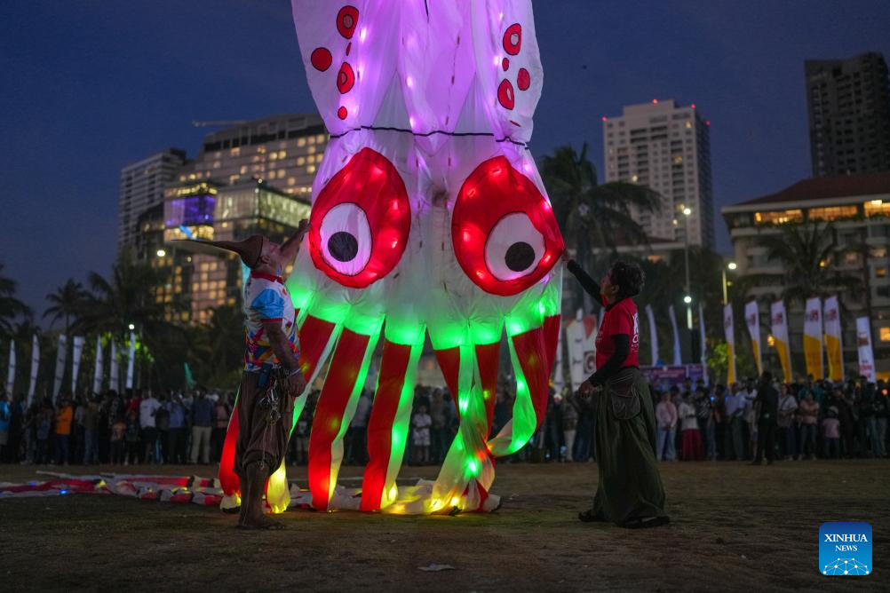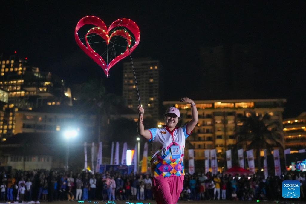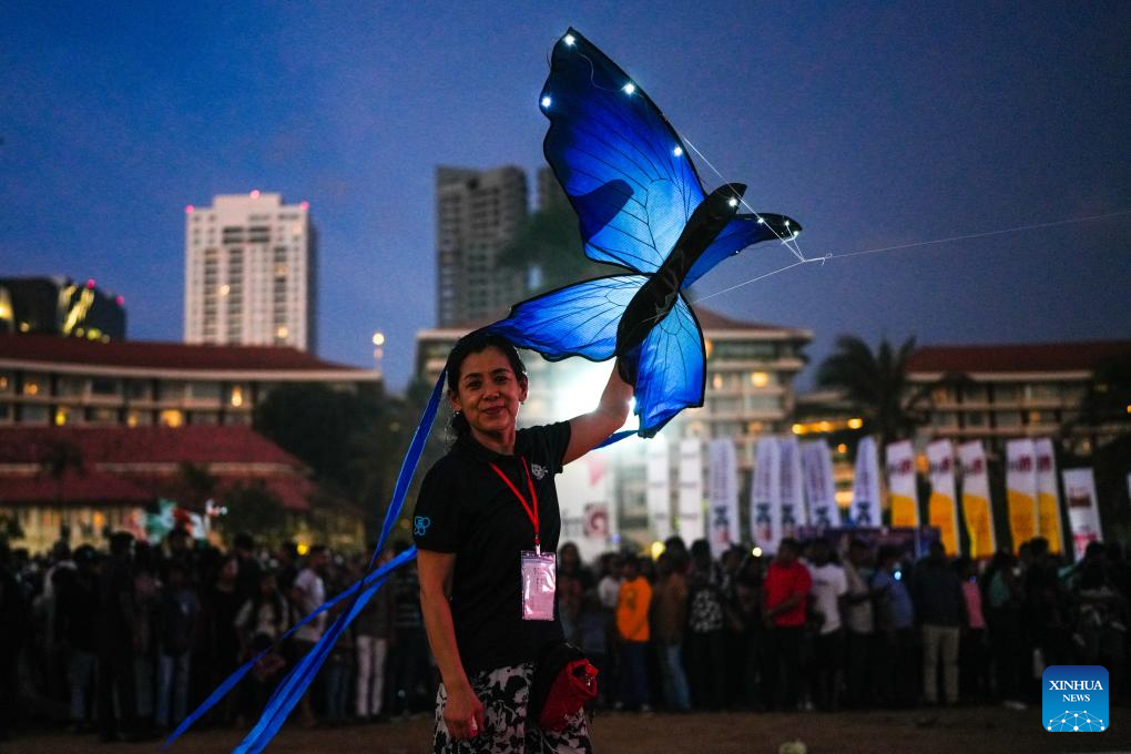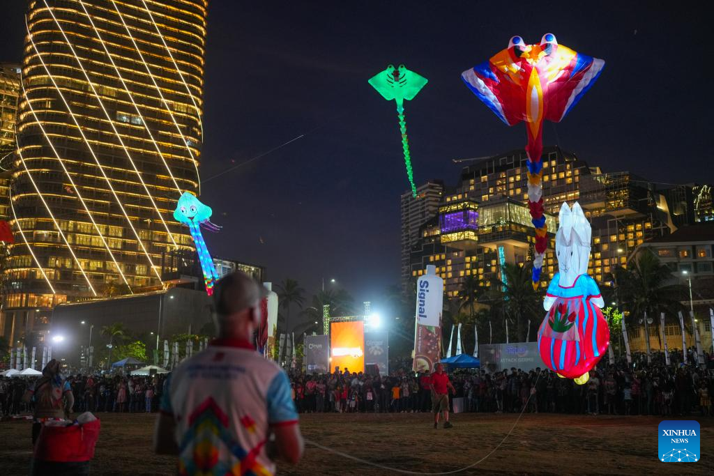 Participants fly illuminated kites during the Colombo International Kite Festival in Colombo, Sri Lanka, Aug. 24, 2025. (Photo by Thilina Kaluthotage/Xinhua)