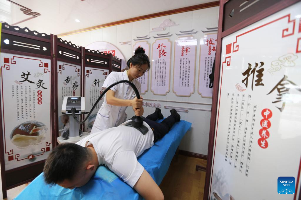 A visitor experiences traditional Chinese medicine (TCM) treatment during the 6th China (Gansu) TCM Industry Expo in Longxi County of Dingxi City, northwest China's Gansu Province, Aug. 24, 2025. The expo opened here on Sunday. (Photo by Wang Kexian/Xinhua)