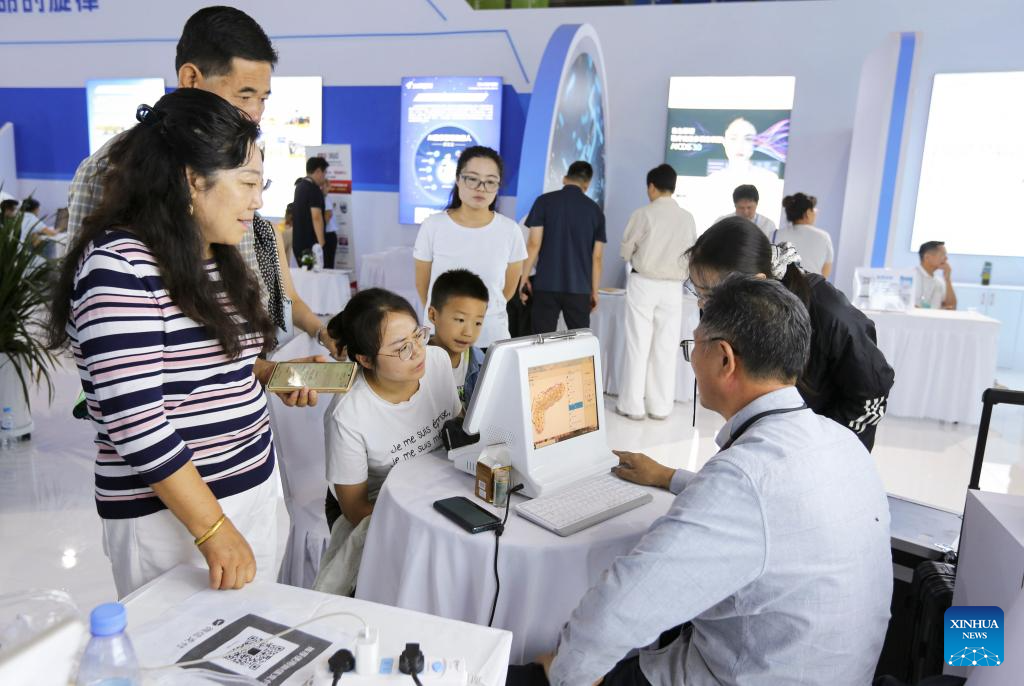 Visitors experience AI-powered traditional Chinese medicine (TCM) healthcare during the 6th China (Gansu) TCM Industry Expo in Longxi County of Dingxi City, northwest China's Gansu Province, Aug. 24, 2025. The expo opened here on Sunday. (Photo by Wang Kexian/Xinhua)