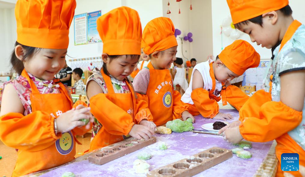 Children learn to make Qiaoguo, a traditional food for Qixi Festival, at a kindergarten in Yinan County of Linyi City, east China's Shandong Province, Aug. 26, 2025. Various activities are held across the country for the upcoming traditional Qixi Festival, or Chinese Valentine's Day, which will fall on Aug. 29 this year. (Photo by Wang Yanbing/Xinhua)