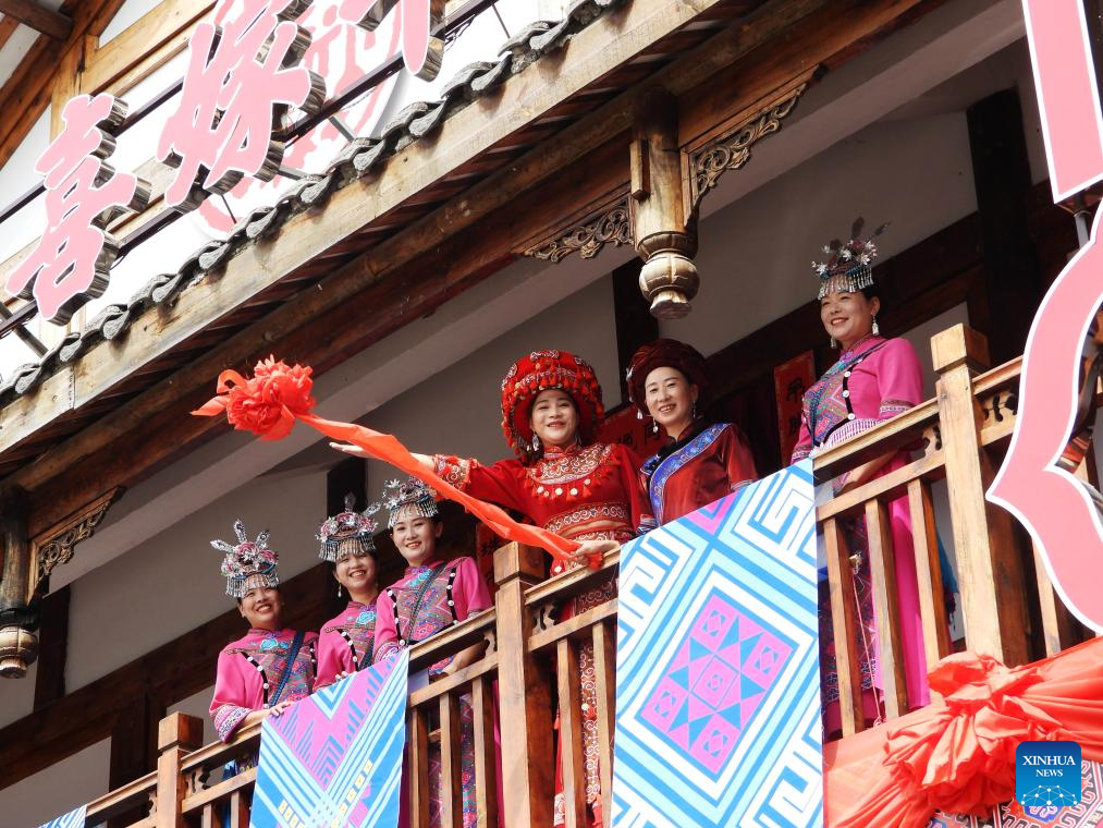 People perform wedding custom of Tujia ethnic group at a scenic area in Dazhou City, southwest China's Sichuan Province, Aug. 26, 2025. Various activities are held across the country for the upcoming traditional Qixi Festival, or Chinese Valentine's Day, which will fall on Aug. 29 this year. (Photo by Deng Liangkui/Xinhua)