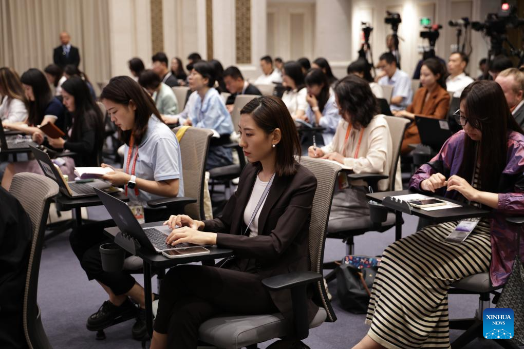 Journalists work at a press conference held by the State Council Information Office (SCIO) on achievements in high-quality energy development during the 14th Five-Year Plan period (2021-2025) in Beijing, capital of China, Aug. 26, 2025. (Xinhua/Zhang Yuwei)