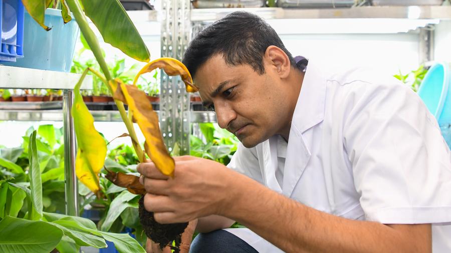 Waseem Raza poses for a photo at a tropical crop breeding lab of Chinese Academy of Tropical Agricultural Sciences in Sanya, south China's Hainan Province, July 29, 2025. (Xinhua/Yang Guanyu)Waseem Raza observes a diseased banana plant in Sanya, south China's Hainan Province, July 29, 2025. (Xinhua/Yang Guanyu)Waseem Raza observes banana plants in Sanya, south China's Hainan Province, July 29, 2025. (Xinhua/Yang Guanyu)