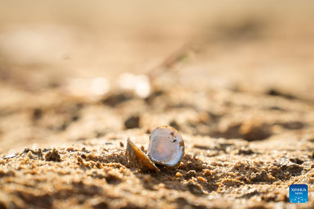 This photo taken on Aug. 26, 2025 shows a shell exposed on the riverbed of the Vistula River in Warsaw, Poland. The lowest water level on record was observed Monday on the Vistula River at the Warsaw-Bulwary hydrological station, the Institute of Meteorology and Water Management (IMGW) reported. (Photo by Jaap Arriens/Xinhua)