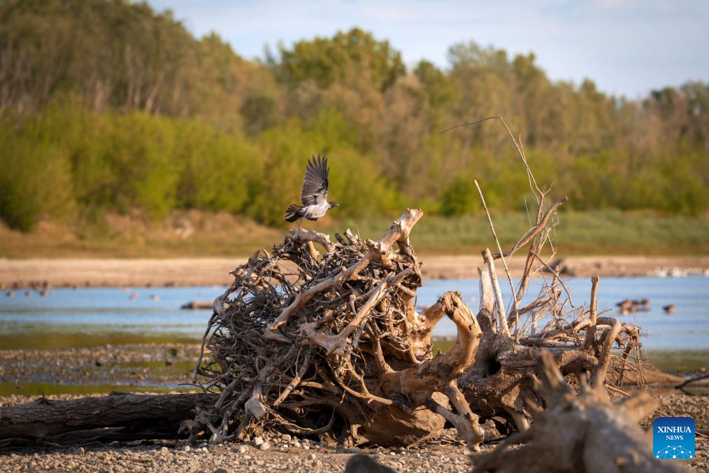 This photo taken on Aug. 26, 2025 shows remains of trees lying on the dried-up riverbed of the Vistula River in Warsaw, Poland. The lowest water level on record was observed Monday on the Vistula River at the Warsaw-Bulwary hydrological station, the Institute of Meteorology and Water Management (IMGW) reported. (Photo by Jaap Arriens/Xinhua)