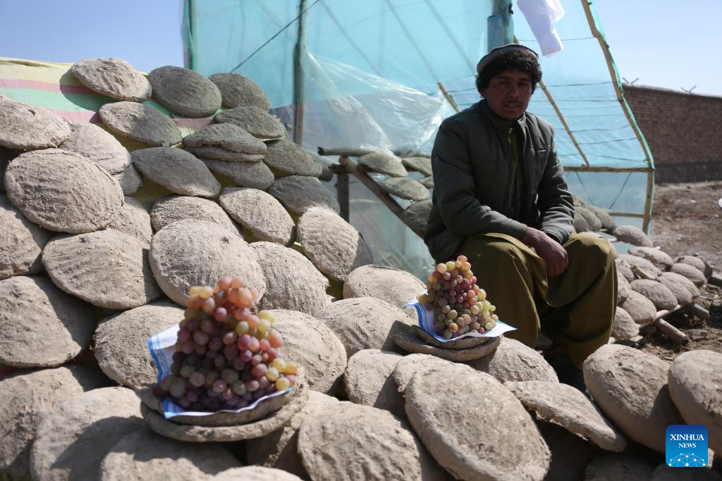 A vendor sells grapes stored in Kangana in Kabul, the capital of Afghanistan, Feb. 23, 2025. The Kangana, an ancient clay jar to preserve grapes, has been widely used in the rural outskirts north of Kabul. This century-old Afghan container enables grapes harvested in the heat of summer to stay fresh until the following spring.