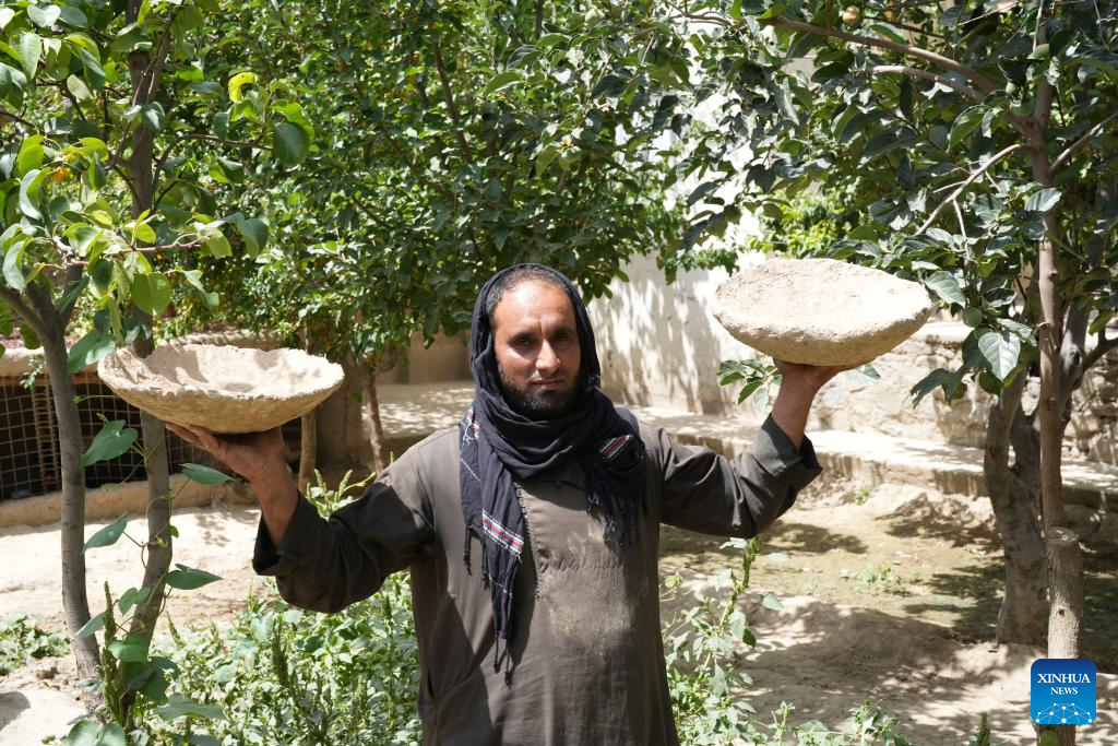 A villager shows bowls of an extra-large Kangana jar in the northern outskirts of Kabul, the capital of Afghanistan, Aug. 25, 2025. The Kangana, an ancient clay jar to preserve grapes, has been widely used in the rural outskirts north of Kabul. This century-old Afghan container enables grapes harvested in the heat of summer to stay fresh until the following spring.