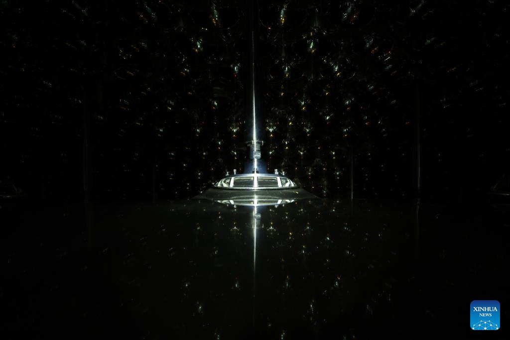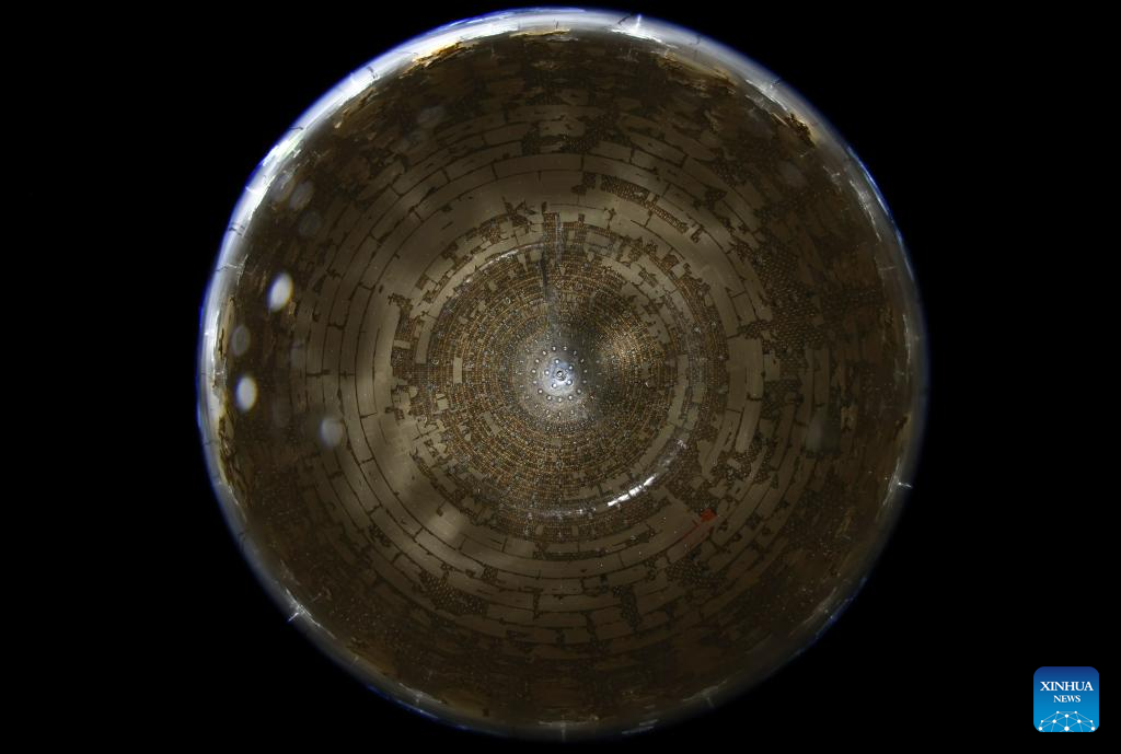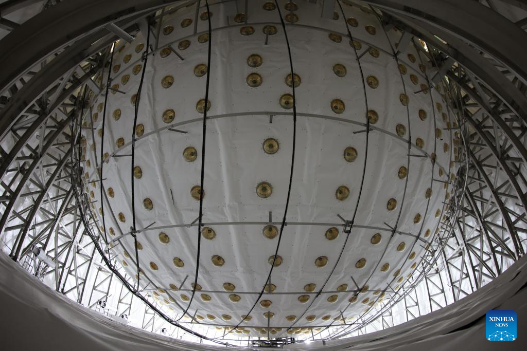 This photo taken on Nov. 22, 2024 shows the acrylic sphere of the central detector of the Jiangmen Underground Neutrino Observatory (JUNO) in Jiangmen, south China's Guangdong Province. The world's largest transparent spherical detector began operation in China on Tuesday, making it the world's first operational ultra-large scientific facility dedicated to neutrino research with ultra-high precision.