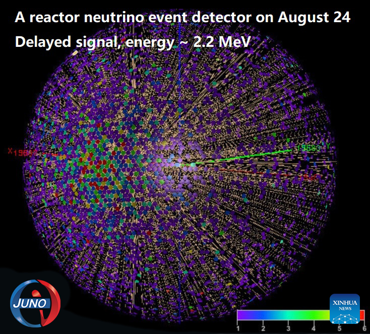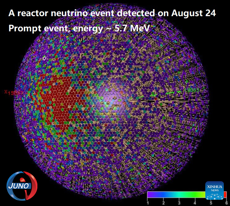 This is a schematic diagram of a reactor neutrino event detected by the Jiangmen Underground Neutrino Observatory (JUNO) in Jiangmen, south China's Guangdong Province, Aug. 24, 2025. The world's largest transparent spherical detector began operation in China on Tuesday, making it the world's first operational ultra-large scientific facility dedicated to neutrino research with ultra-high precision.