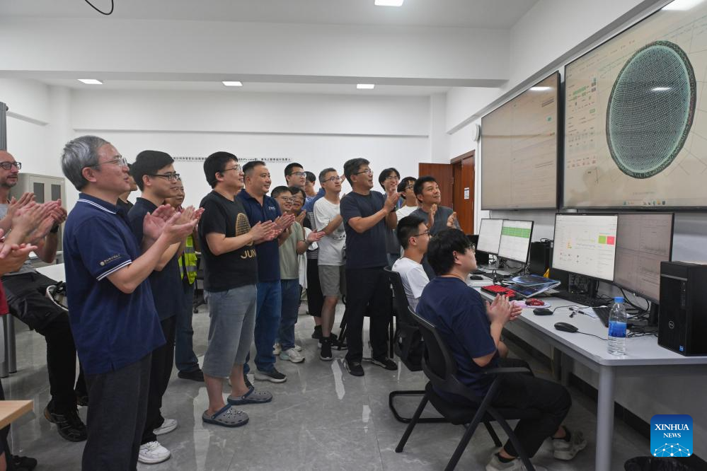 Researchers applaud to celebrate the successful data acquisition at a control room of the Jiangmen Underground Neutrino Observatory (JUNO) in Jiangmen, south China's Guangdong Province, Aug. 26, 2025. The world's largest transparent spherical detector began operation in China on Tuesday, making it the world's first operational ultra-large scientific facility dedicated to neutrino research with ultra-high precision.
