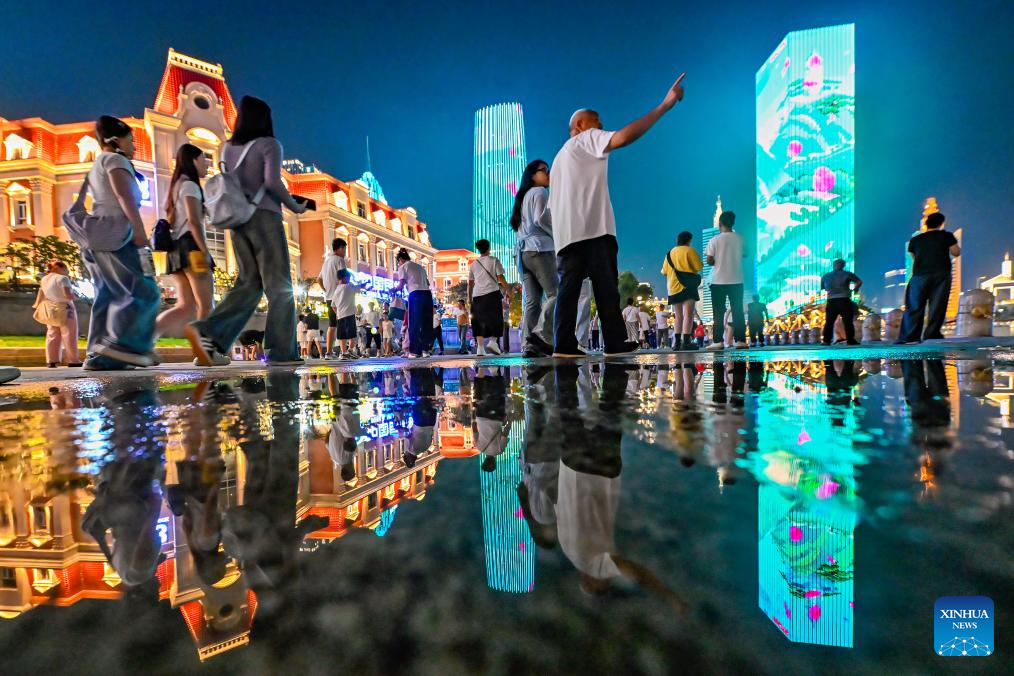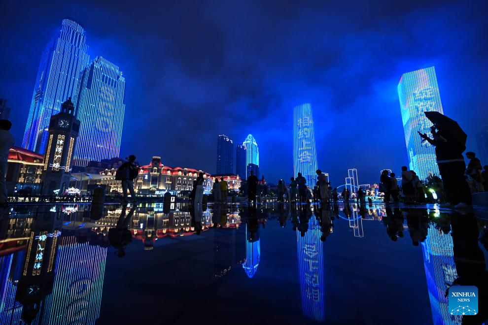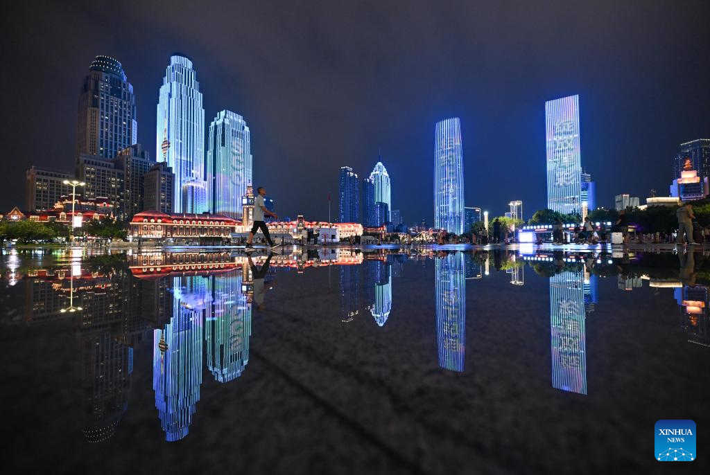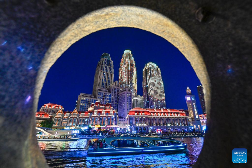 People enjoy the night view by the Haihe River in north China's Tianjin, Aug. 25, 2025. The SCO Summit 2025 will be held here from Aug. 31 to Sept. 1. (Photo by Du Penghui/Xinhua)