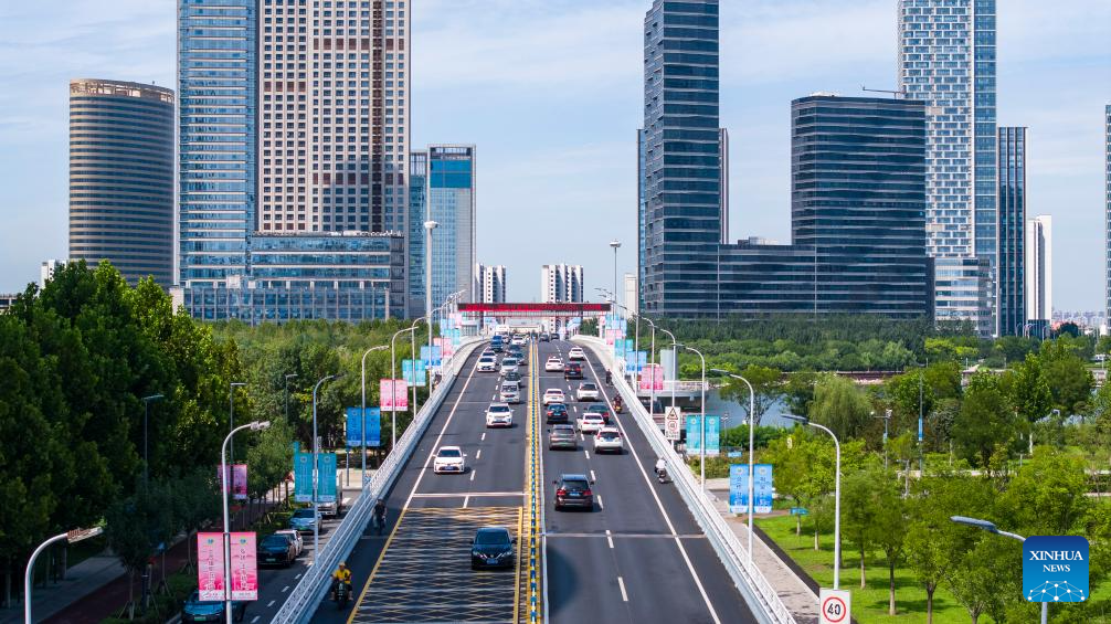 A drone photo taken on Aug. 22, 2025 shows light poles adorned with banners marking the upcoming Shanghai Cooperation Organization (SCO) Summit 2025 in Binhai New Area, north China's Tianjin. The SCO Summit 2025 will be held here from Aug. 31 to Sept. 1. (Xinhua/Zhao Zishuo)