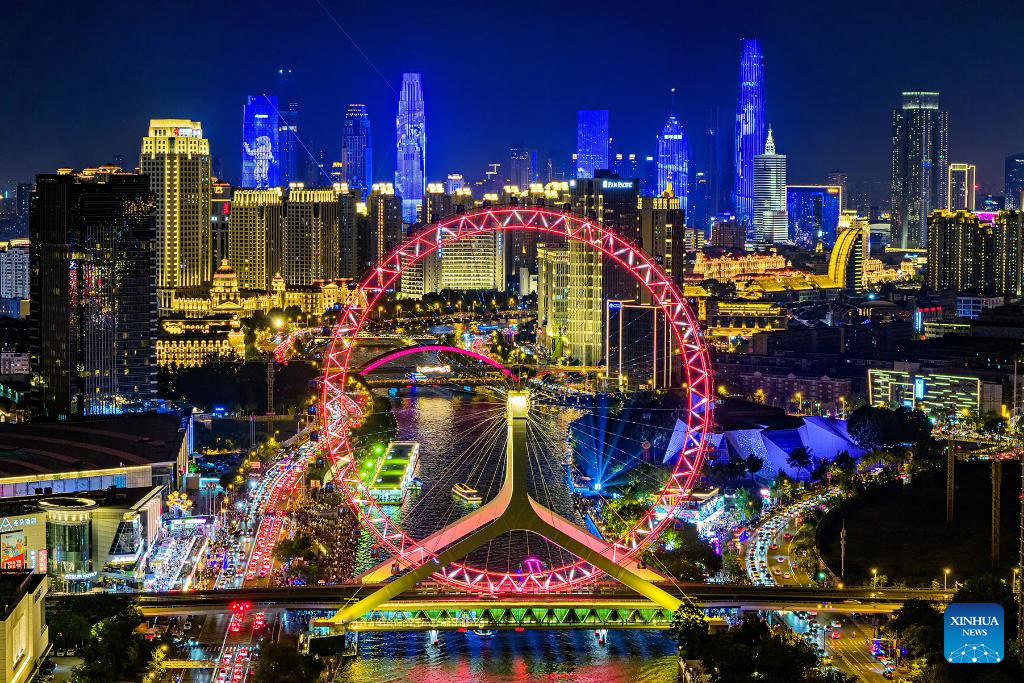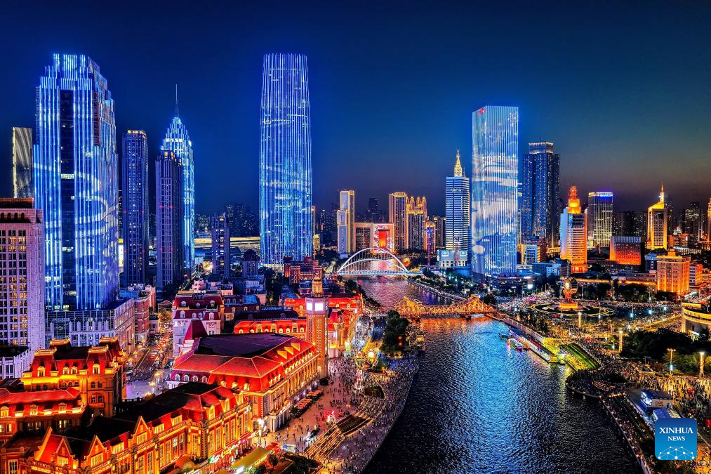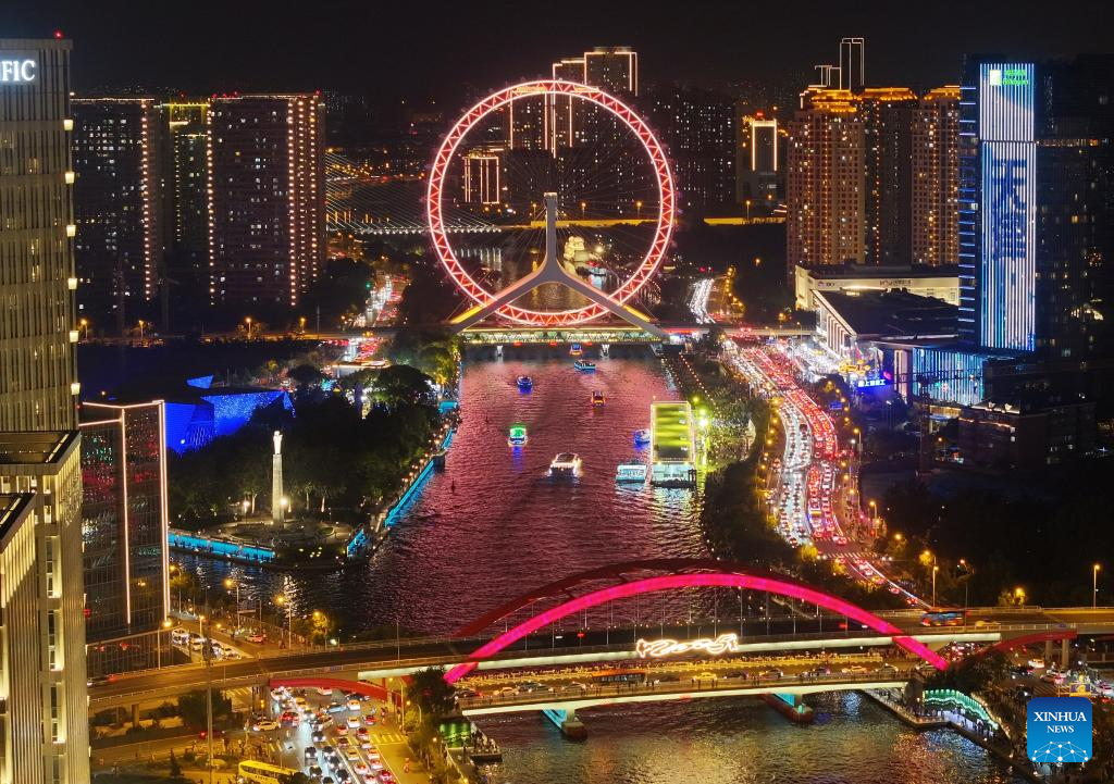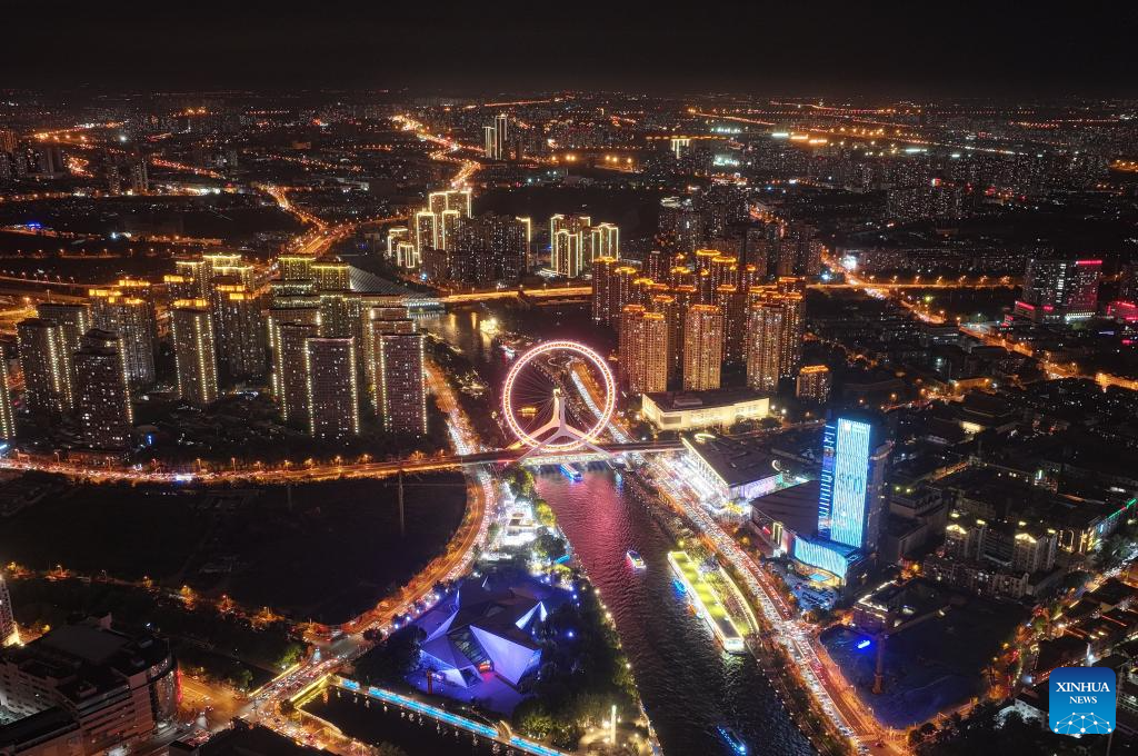An aerial drone photo taken on Aug. 22, 2025 shows a night view along the Haihe River in north China's Tianjin. The SCO Summit 2025 will be held here from Aug. 31 to Sept. 1. (Xinhua/Li Ran)