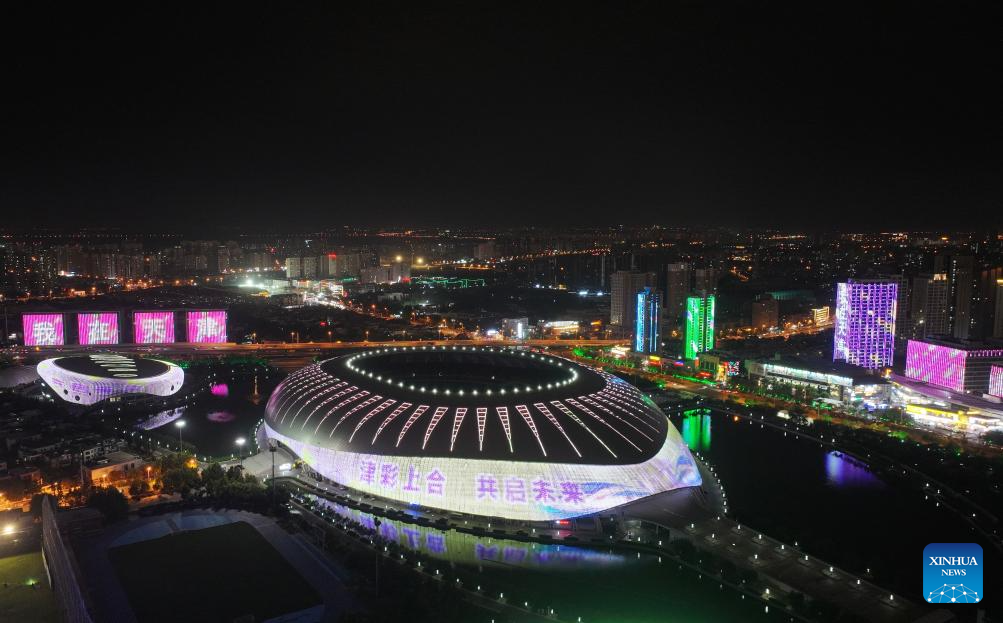 An aerial drone photo taken on Aug. 22, 2025 shows a night view of the Tianjin Olympic Center Stadium in north China's Tianjin. The SCO Summit 2025 will be held here from Aug. 31 to Sept. 1. (Xinhua/Li Ran)