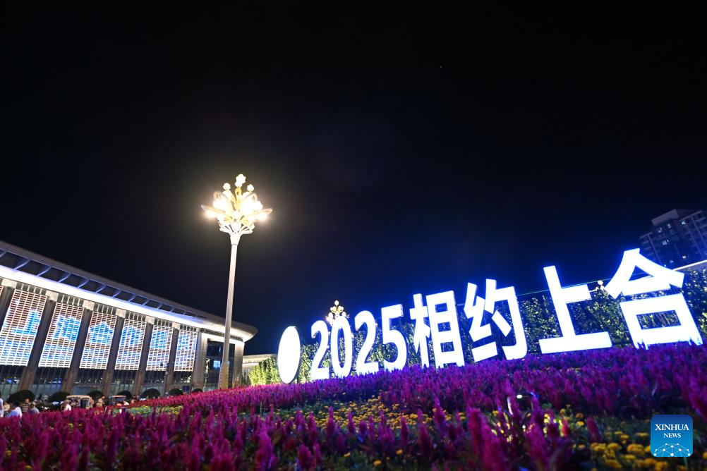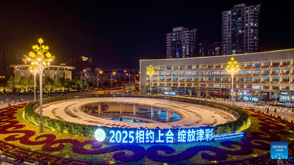 A night scene with a light installation marking the upcoming Shanghai Cooperation Organization (SCO) Summit 2025 is pictured on the square behind the Tianjin Railway Station, Aug. 22, 2025. The SCO Summit 2025 will be held here from Aug. 31 to Sept. 1. (Xinhua/Li Ran)