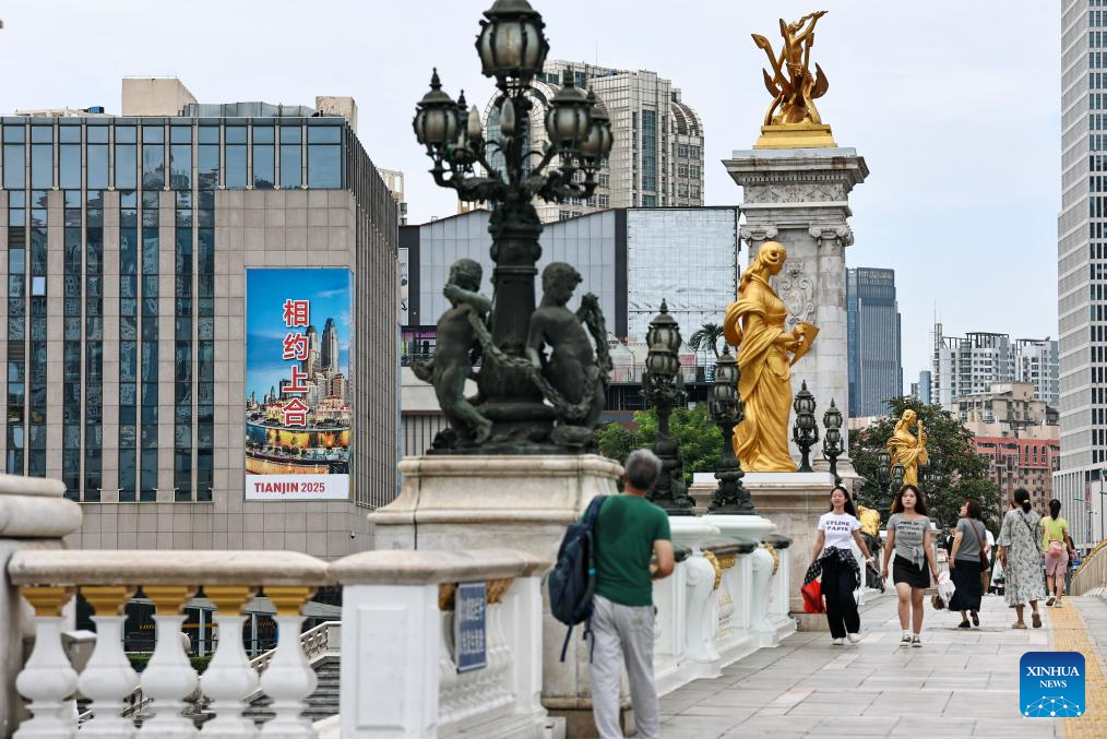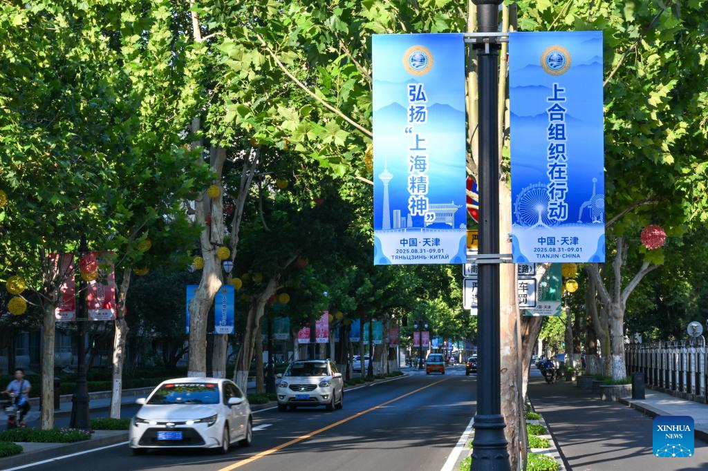 Banners marking the upcoming Shanghai Cooperation Organization (SCO) Summit 2025 are pictured on a street in north China's Tianjin, Aug. 25, 2025. The SCO Summit 2025 will be held here from Aug. 31 to Sept. 1. (Xinhua/Sun Fanyue)