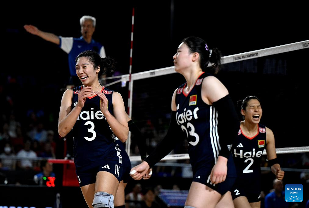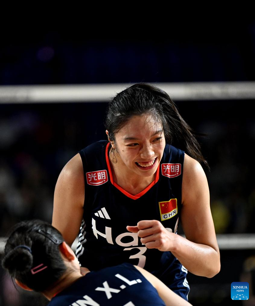 Tang Xin of China celebrates after the Preliminary Phase Pool F match between China and Colombia at the Volleyball Women's World Championship in Chiang Mai, Thailand, Aug. 25, 2025. (Xinhua/Hou Zhaokang)