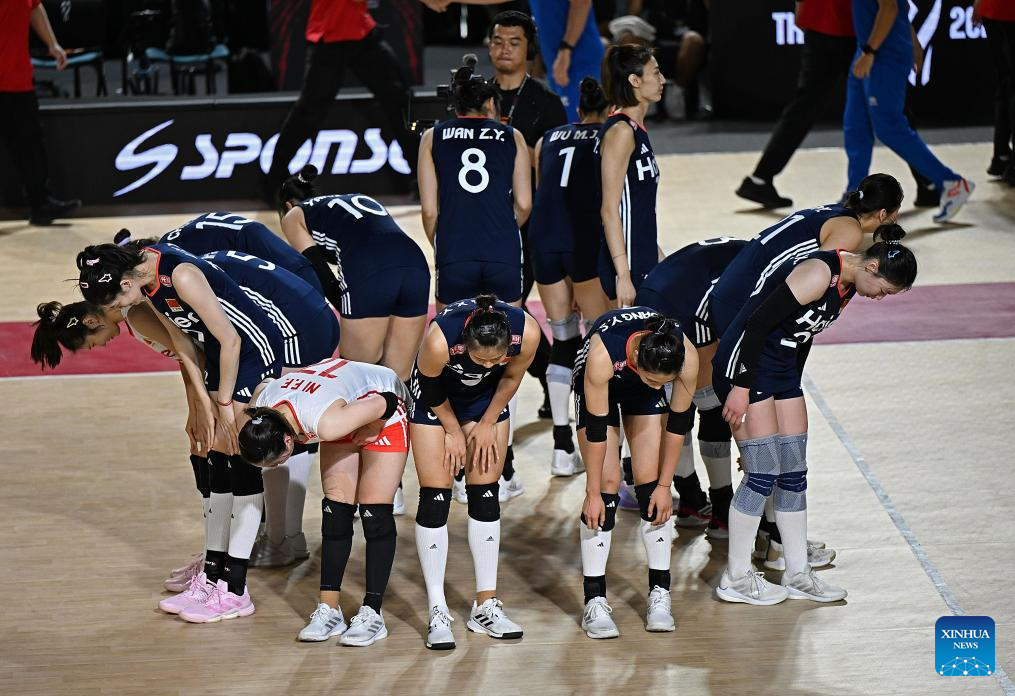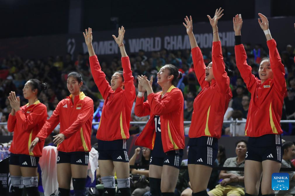 Players of China greet spectators after the Preliminary Phase Pool F match between China and Colombia at the Volleyball Women's World Championship in Chiang Mai, Thailand, Aug. 25, 2025. (Xinhua/Hou Zhaokang)