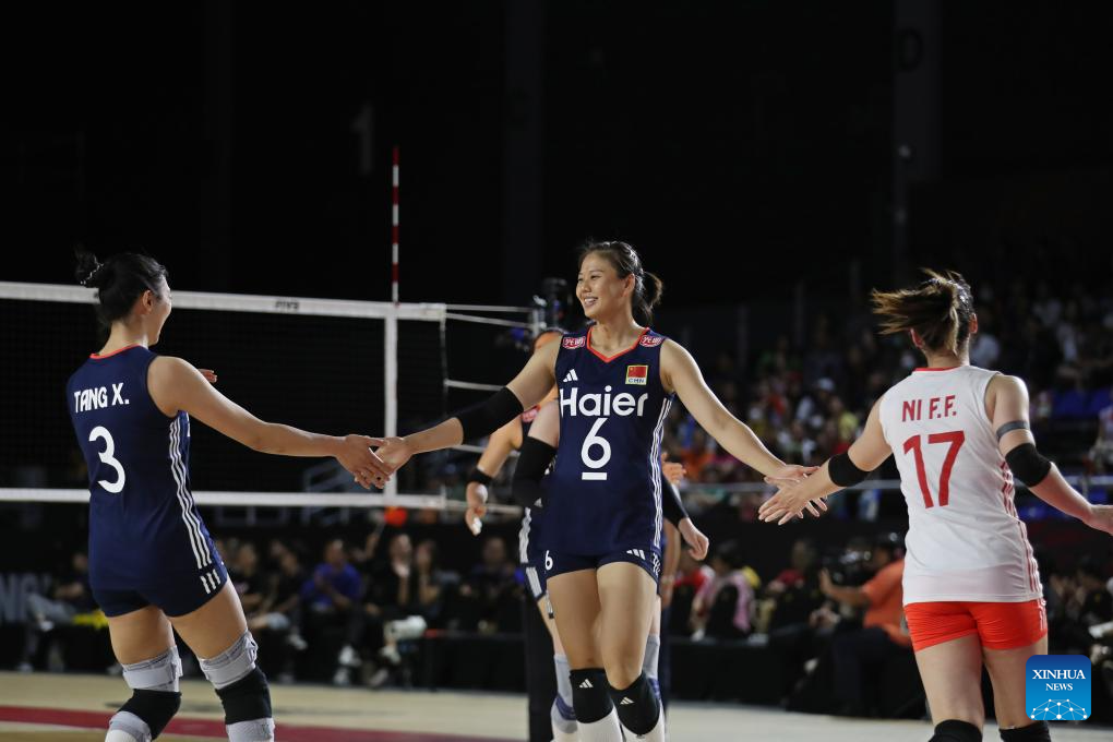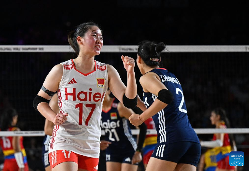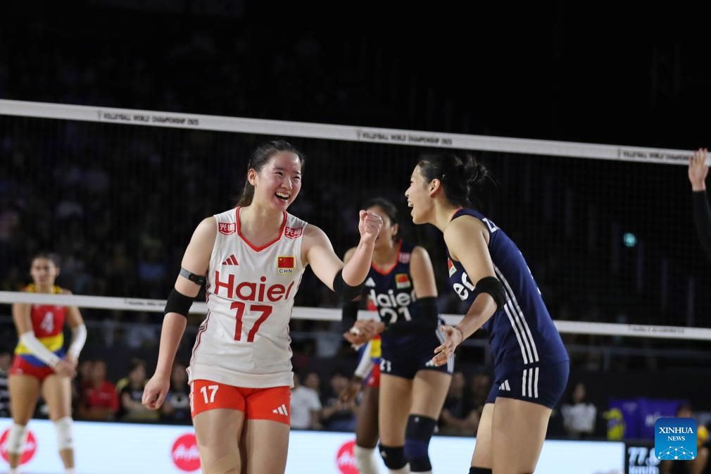 Ni Feifan (L) of China celebrates scoring with teammates during the Preliminary Phase Pool F match between China and Colombia at the Volleyball Women's World Championship in Chiang Mai, Thailand, Aug. 25, 2025. (Xinhua/Hou Zhaokang)
