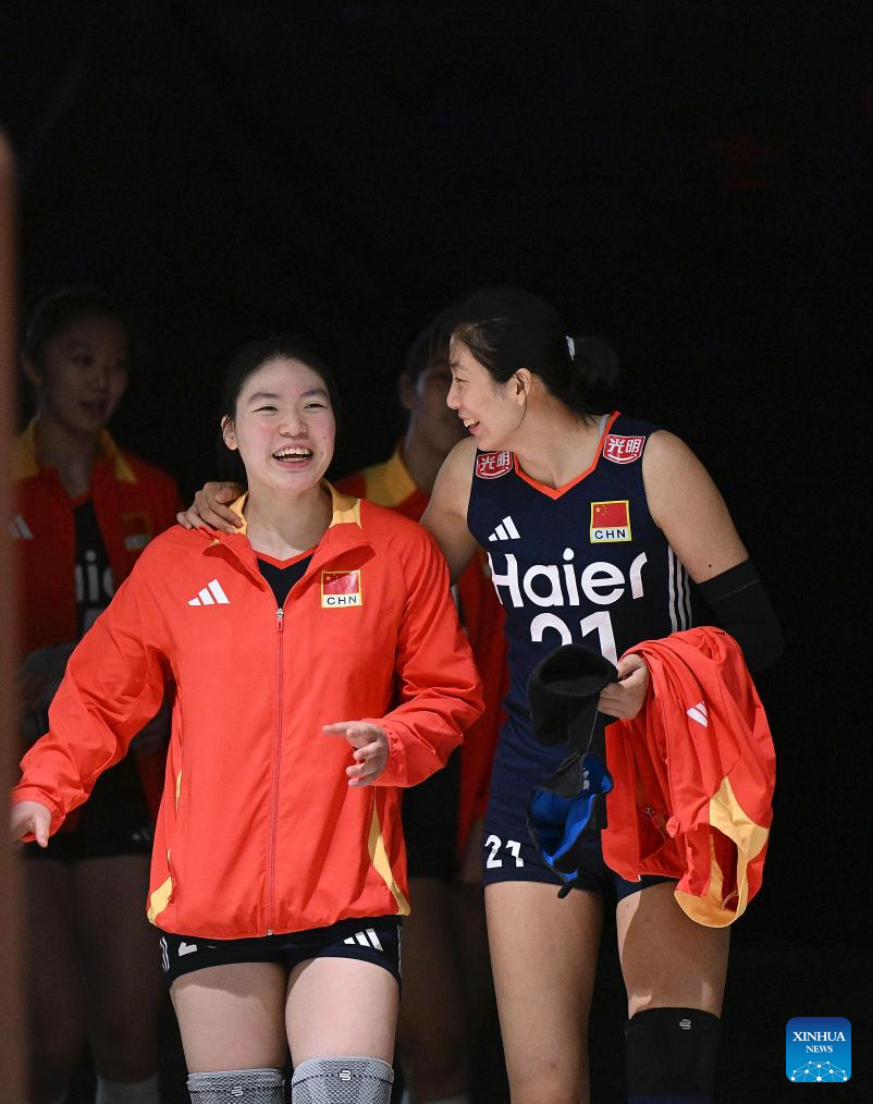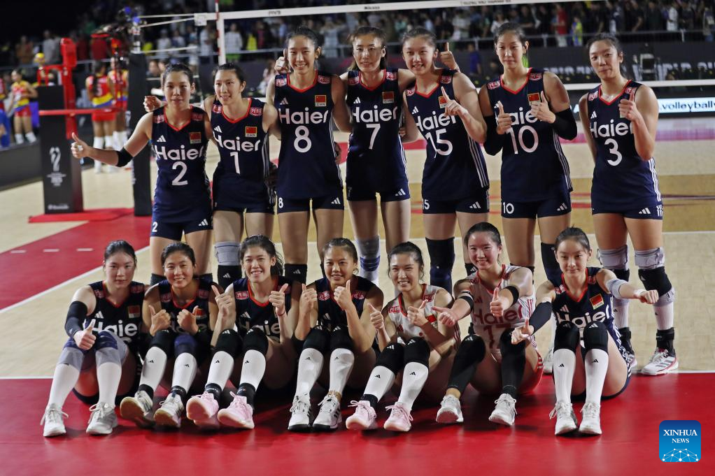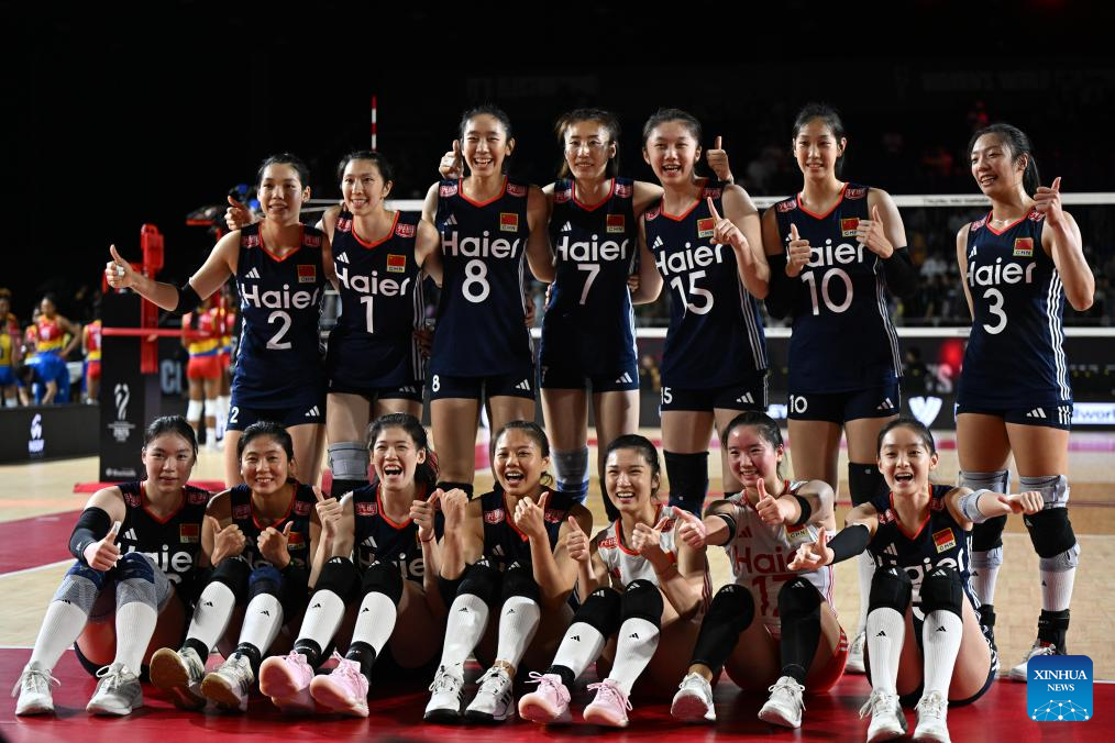 Players of China pose for photos after the Preliminary Phase Pool F match between China and Colombia at the Volleyball Women's World Championship in Chiang Mai, Thailand, Aug. 25, 2025. (Xinhua/Hou Zhaokang)