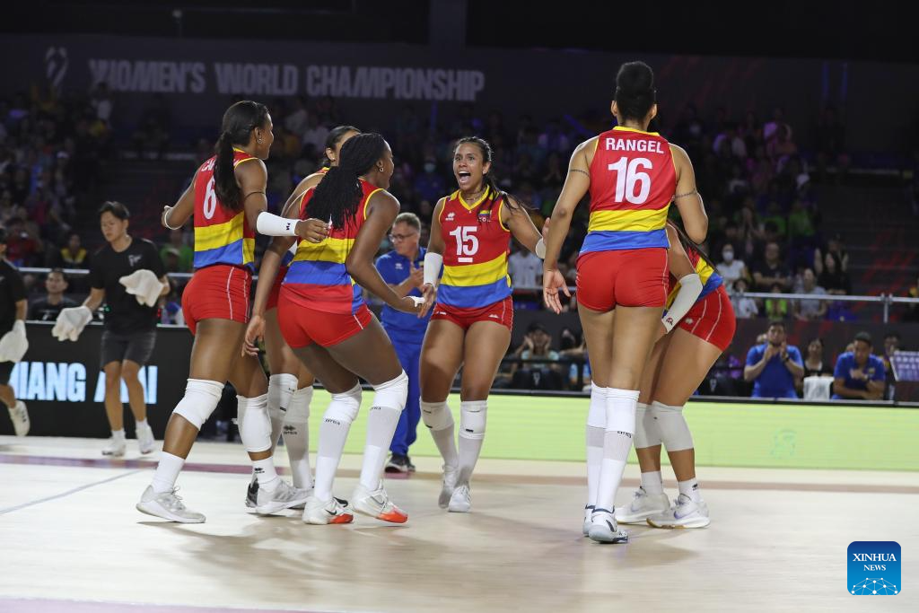 Players of Colombia celebrate scoring during the Preliminary Phase Pool F match between China and Colombia at the Volleyball Women's World Championship in Chiang Mai, Thailand, Aug. 25, 2025. (Xinhua/Hou Zhaokang)