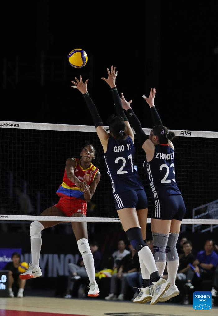 Dayana Segovia (1st L) of Colombia competes during the Preliminary Phase Pool F match between China and Colombia at the Volleyball Women's World Championship in Chiang Mai, Thailand, Aug. 25, 2025. (Xinhua/Sun Weitong)