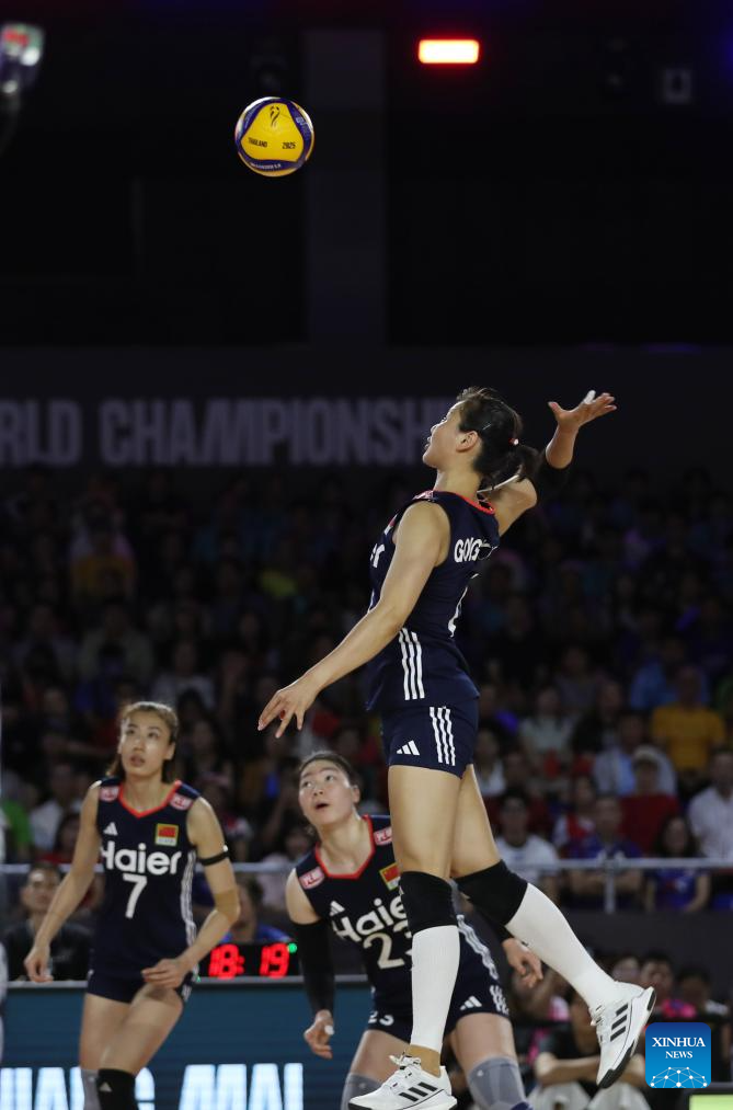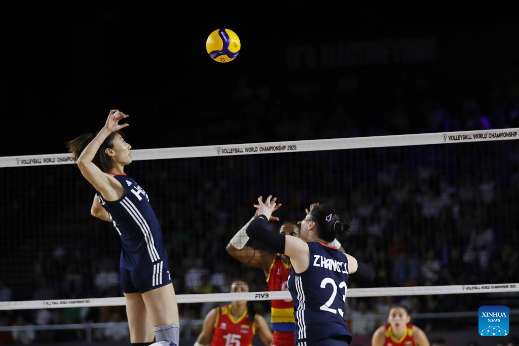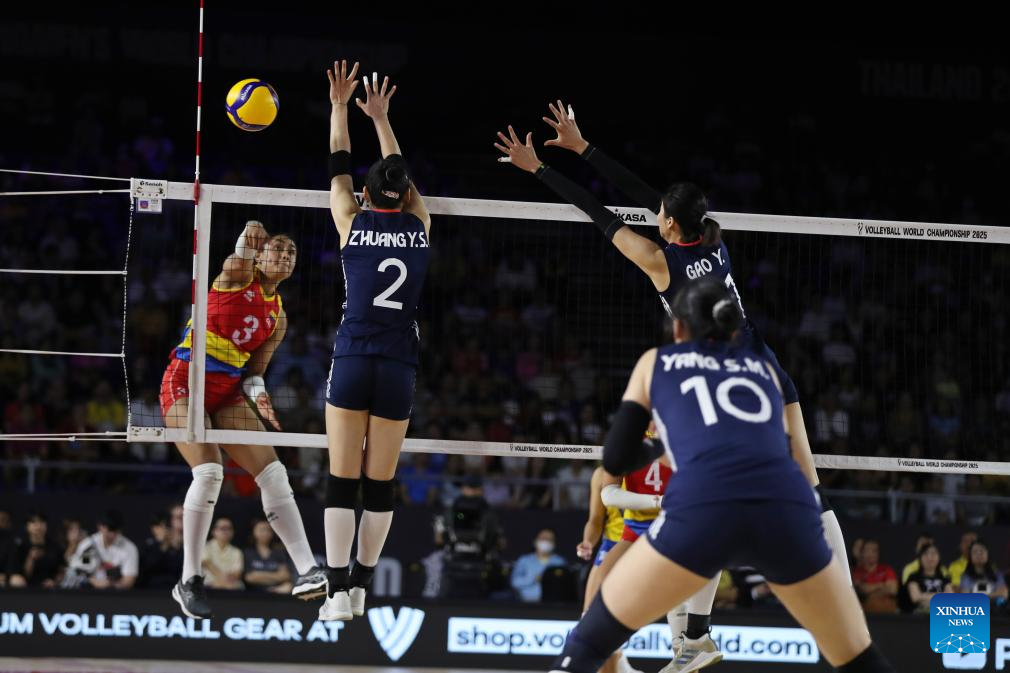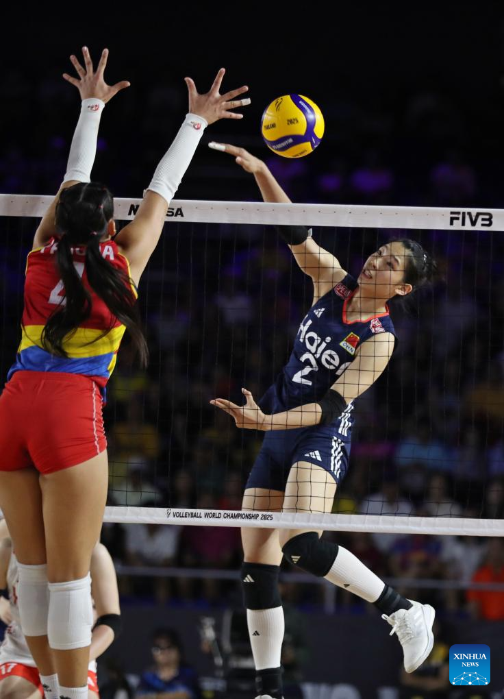 Wang Yuanyuan (top) of China competes during the Preliminary Phase Pool F match between China and Colombia at the Volleyball Women's World Championship in Chiang Mai, Thailand, Aug. 25, 2025. (Xinhua/Sun Weitong)