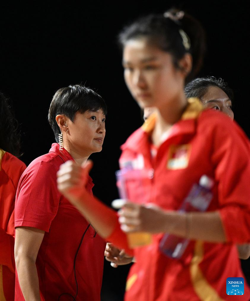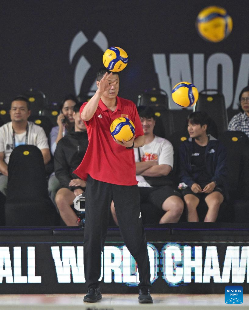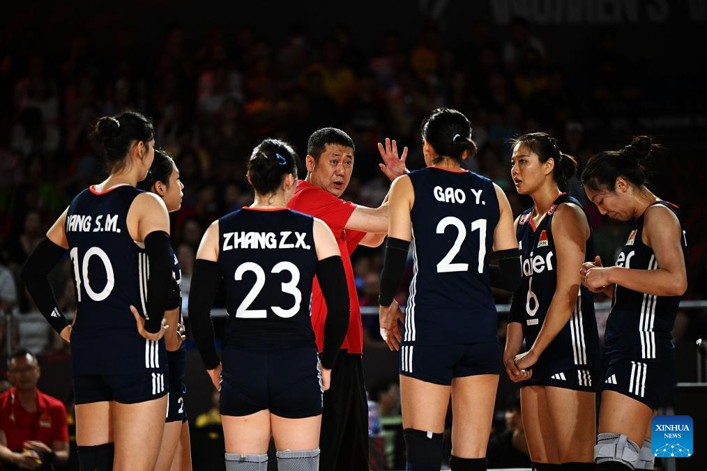 Zhao Yong (C), head coach of China instructs players during the Preliminary Phase Pool F match between China and Colombia at the Volleyball Women's World Championship in Chiang Mai, Thailand, Aug. 25, 2025. (Xinhua/Hou Zhaokang)