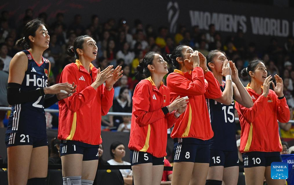 Players of China cheer up for teammates on the court during the Preliminary Phase Pool F match between China and Colombia at the Volleyball Women's World Championship in Chiang Mai, Thailand, Aug. 25, 2025. (Xinhua/Hou Zhaokang)
