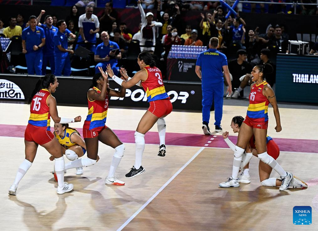 Players of Colombia celebrate during the Preliminary Phase Pool F match between China and Colombia at the Volleyball Women's World Championship in Chiang Mai, Thailand, Aug. 25, 2025. (Xinhua/Sun Weitong)