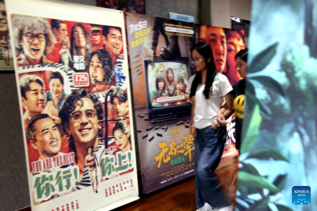 A spectator walks past movie posters at a cinema in Qingzhou, east China's Shandong Province, Aug. 17, 2025. China's summer box office revenue has surpassed 11 billion yuan (about 1.5 billion U.S. dollars) as of Sunday, with homegrown titles dominating the season's top earners. (Photo by Wang Jilin/Xinhua)