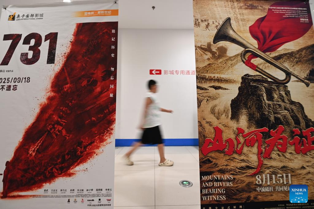 Spectators walk past movie posters at a cinema in Linyi, east China's Shandong Province, Aug. 18, 2025. China's summer box office revenue has surpassed 11 billion yuan (about 1.5 billion U.S. dollars) as of Sunday, with homegrown titles dominating the season's top earners. (Photo by Wu Jiquan/Xinhua)