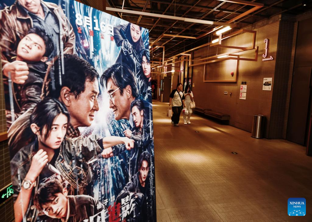 Spectators walk past movie posters at a cinema in Wuhan, central China's Hubei Province, Aug. 25, 2025. China's summer box office revenue has surpassed 11 billion yuan (about 1.5 billion U.S. dollars) as of Sunday, with homegrown titles dominating the season's top earners. (Photo by Zhao Jun/Xinhua)