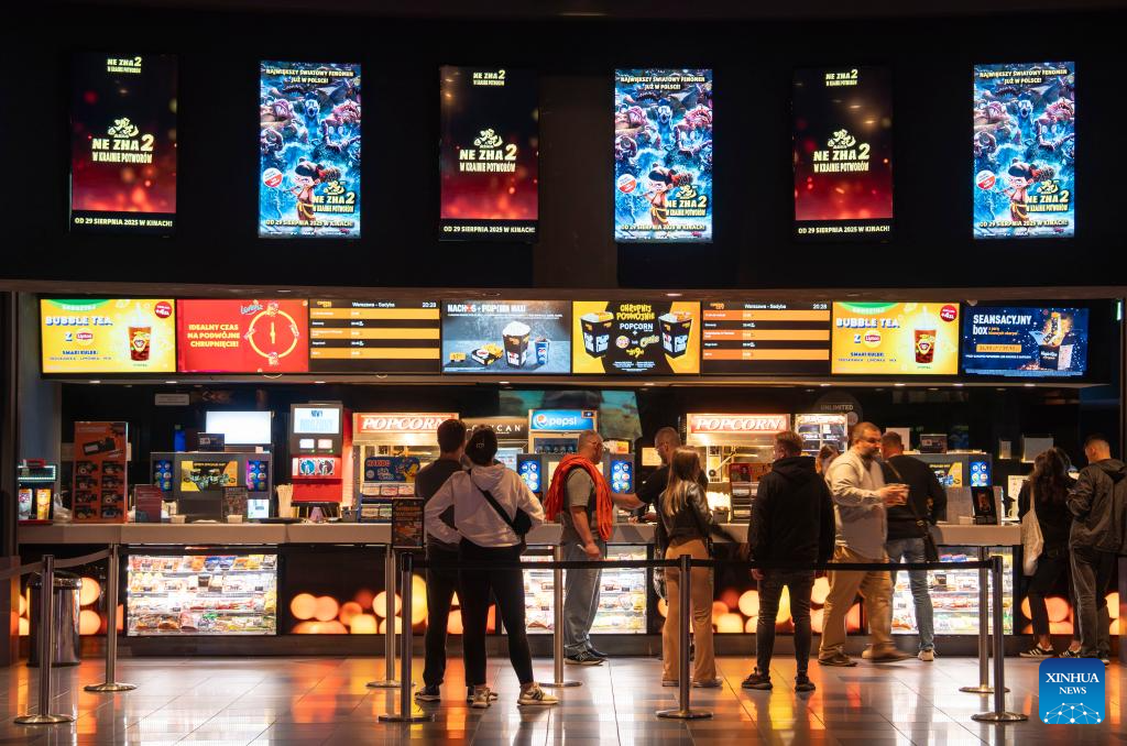 Posters of the Chinese animated film Ne Zha 2 are displayed at the ticketing area of a cinema in Warsaw, Poland on Aug. 26, 2025. The film is scheduled for official release in Poland on Aug. 29. (Xinhua/Xia Yuanyi)